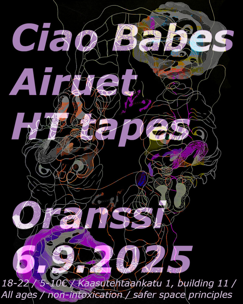 | Lisätietoja: | Oranssi // Saturday 6.9. // Ciao Babes cassette tape release show // with Airuet and HT tapes Doors 18.00 Bands 18.30-22.00 Tickets 5-10¤ Safer space principles |