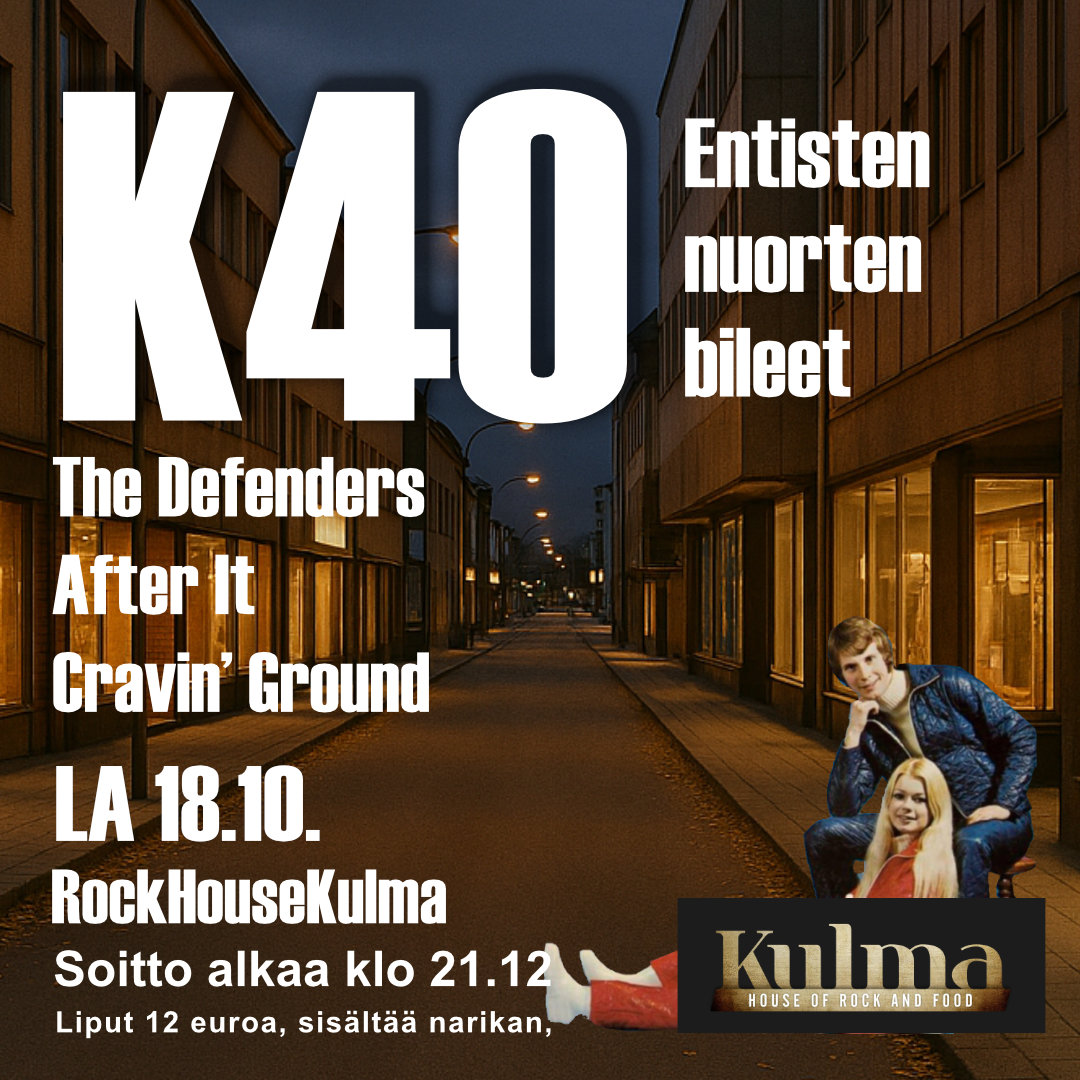 Lisätietoja: | K40 – Entisten nuorten bileet - Melko vähällä, näin paljon! Tule mukaan iltaan, jossa musiikki ei vain soi – se herättää muistoja, kutittelee tunteita ja vie suoraan nuoruuden villiin yöhön. Tämä ei ole pelkkä keikka, vaan tilaisuus kohdata vanhoja tuttuja, nauraa menneille ja luoda uusia tarinoita, jotka kestävät seuraavatkin vuosikymmenet. Rockhouse Kulman rento interiööri ja notkea henkilökunta luo täydelliset puitteet tälle hauskalle illalle aivan kaupungin ytimessä. Samalta kujalta saa tarvittaessa mukaan myös varhaisaamun aamiaisen. Liput 12 euroa Eka bändi lavalla klo 21.12 – tule ajoissa! The Defenders – Kitarat helisevät, beat kulkee The Defenders tuo lavalle brittipopin kultakauden parhaat palat – melodiset koukut, stemmalaulut ja helisevät kitarat, jotka vievät suoraan 60-luvun sydämeen. Tämä kokeneiden soittajien ryhmä ei tingi tyylistä eikä tunnelmasta. Beat-komppi pitää jalan liikkeessä ja hymyn huulilla – klassista kamaa, klassisella otteella. After It – Hikistä rokkia ja hyvää fiilistä After It ei kaunistele – se rokkaa. Kolmipäinen koneisto takoo lavalla energian, joka tarttuu lanteisiin ja nostaa tunnelman kattoon. Setti kulkee vauhdista herkkyyteen, mutta aina tunteella. Kun tämä trio pääsee vauhtiin, ei lattiakaan pysy paikoillaan. Cravin’ Ground – Klassikkorockia Kajaanista Cravin’ Ground tuo lavalle suomirockin legendat ja klassikot sellaisella intensiteetillä, että jokainen kappale tuntuu omalta. Kajaanilainen kokoonpano soittaa sydämellä ja karismalla – lavalla syntyy hetkiä, jotka jäävät mieleen. Jos rakastat kitaraa, rytmiä ja suomirokkia, tämä bändi on sinun valintasi. Näin vähällä, näin paljon. Tervetuloa K40-bileisiin – sinne, missä musiikki muistaa puolestasi. |