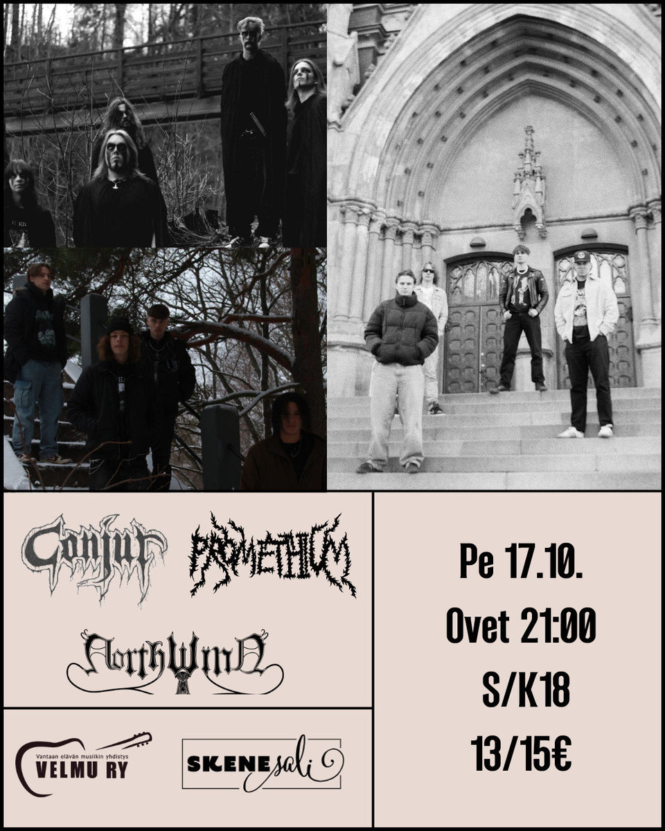 Lisätietoja: | Kolme nuorta death-black-thrash metal akselilla operoivaa yhtyettä lokakuussa Skenesalissa! Northwind: Illan paikallista puolta edustaa vuonna 2019 perustettu Northwind yhdistelee musiikissaan folk black metallin ja melodisen death metallin elementtejä. Lyriikalliset vaikutteet bändi ammentaa suomalaisesta muinaisuskosta, luonnosta ja kalevalasta. Tämä keikka on paluu bändin juurille sillä Northwind on saanut alkunsa Myyrmäessä Vaskivuoren lukiolla. Promethium: Promethium, Mystisen tuntusta Death Metallia joka tuo jopa esoteerisen tunnelman tuhoavilla riffeillä, hyvin juurtunut vaikutteisiin Cannibal Corpse, Worm ja Obscura. Conjur: Conjur on vuonna 2023 perustettu bändi Espoon Suvelasta, jonka tyylisuuntaa voi kuvailla vanhan ajan thrashiksi sovitettuna nykyaikaan. Biiseistä löytyy niin nopeita kuin raskaita riffejä sekä tietysti kunnon sooloja. Bändin debyyttialbumi julkaistiin viime huhtikuussa, ja tällä hetkellä kirjoitetaan uutta musiikkia. Ikärajaton/K18 Ovet klo 21:00 Showtime 21:30 Liput ennakkoon Tiketistä 13¤. Ovelta 15¤ https://www.tiketti.fi/conjur-promethium-northwind-skenesali-vantaa-lippuja/112253 |