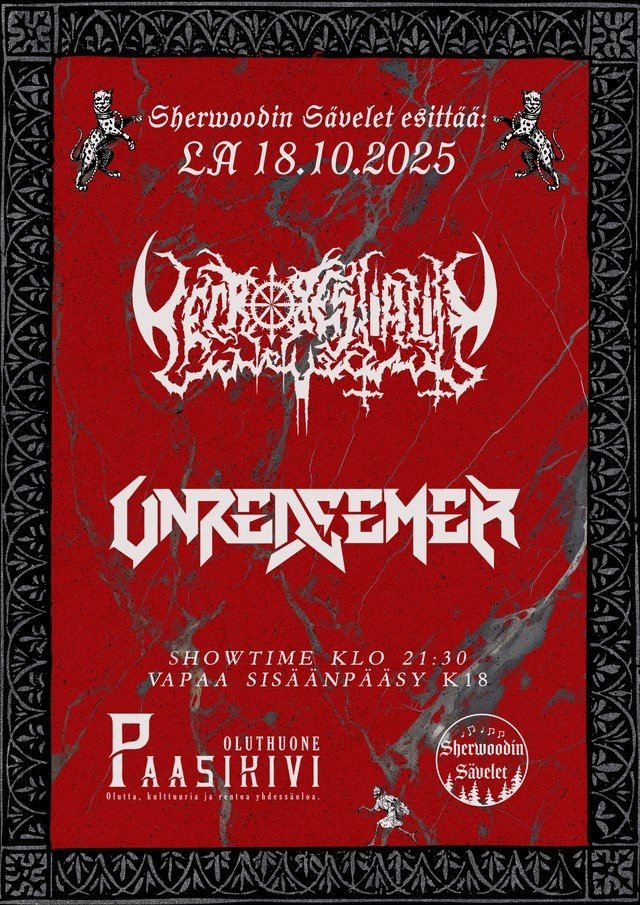 Lisätietoja: | Sherwoodin sävelet esittää: LA 18.10.2025 Necrobestiality, Unredeemer Oluthuone Paasikivi Paasikivenkatu 4, Kerava K18, vapaa pääsy NECROBESTIALITY Necrobestiality on keravalainen, täysin uusi black metal kokoonpano joka yhdistelee ysärin mahtipontista soundia ja suomalaista kaihoa. Tuloksena on kauhun ja hullunkurisuuden rajamailla tanssiva painajainen! Ps. syntsa kuuluu bläkyyn. UNREDEEMER Unredeemer on Kerava-Vantaa-Helsinki akselilta kotoisin operoiva tummapuhuvan rässin ja deathmetallin epäpyhä kollektiivi, joka johdattaa kuulijat kohti vääjäämätöntä epävapahdusta. Unredeem yourself! |