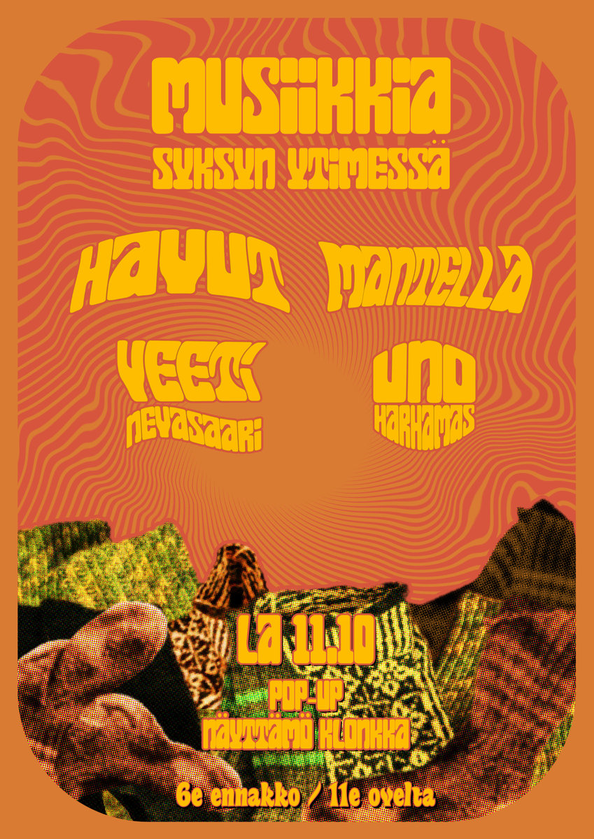 Lisätietoja: | MUSIIKKIA SYKSYN YTIMESSÄ POP-UP NÄYTTÄMÖ KLONKASSA Syksyn illat pimenevät entisestään, mutta valonpilkahduksia korvillesi tarjoavat Havut, Mantella, Veeti Nevasaari ja Uno Harhamas.Vedä siis jalkaan mukavimmat villasukkasi ja suuntaa Pop-Up näyttämö Klonkkaan nauttimaan elävästä musiikista, virvokkeista ja hyvästä tunnelmasta. Aikataulu 21:10-21:50 Uno Harhamas 22:10-22:50 Veeti Nevasaari 23:10-23:50 Havut 00:10-01:00 Mantella Liput Ovelta 11¤ Ennakkoon tiketistä 6¤ (+mahdolliset tiketin lisäkulut) MANTELLA Monenkirjavaa rockia soittava viisihenkinen Mantella lainaa vaikutteita musiikkiinsa laajalta skaalalta eri rockin alalajeista, sekä jazzista ja popista. Siksipä Mantellan livekeikoilta ei puutu dynaamiikkaa kun sukelletaan tanssittavista rytmeistä psykedelian täytteisiin fiilistelyihin. HAVUT Havut on oululainen viisihenkinen kokoonpano, joka soittaa heleästi soivaa, mutta myös tummia vesiä luotaavaa nuotiofolkpoppia. Yhtyeen musiikki rakentuu lämpimistä sävyistä, ilmavista sovituksista ja tarinallisista lyriikoista, jotka kutsuvat kuulijan viipyilemään hetkissä ja maisemissa. VEETI NEVASAARI Oululainen Veeti Nevasaari esittää omaa kotipolttoista vaihtoehtopoppiaan syntikkapianon ja rumpukoneen säestämänä. Veeti Nevasaaren tuorein kesäsinkku Kotiviini ja Korkiasaari kuultavissa suoratoistopalveluissa! UNO HARHAMAS Uno Harhamas -nimen takaa löytyy kokenut oululainen muusikko Antti Saarilampi, joka tunnetaan mm. yhtyeistä The Aeon, Mädätys, Mustasuo sekä Suomen Tulli, ja joka on myös säveltänyt teatteri-, elokuva- ja pelimusiikkia. Tässä projektissaan hän kanavoi progressiivisia musiikillisia seikkailuja akustisen kitaransa kautta. |