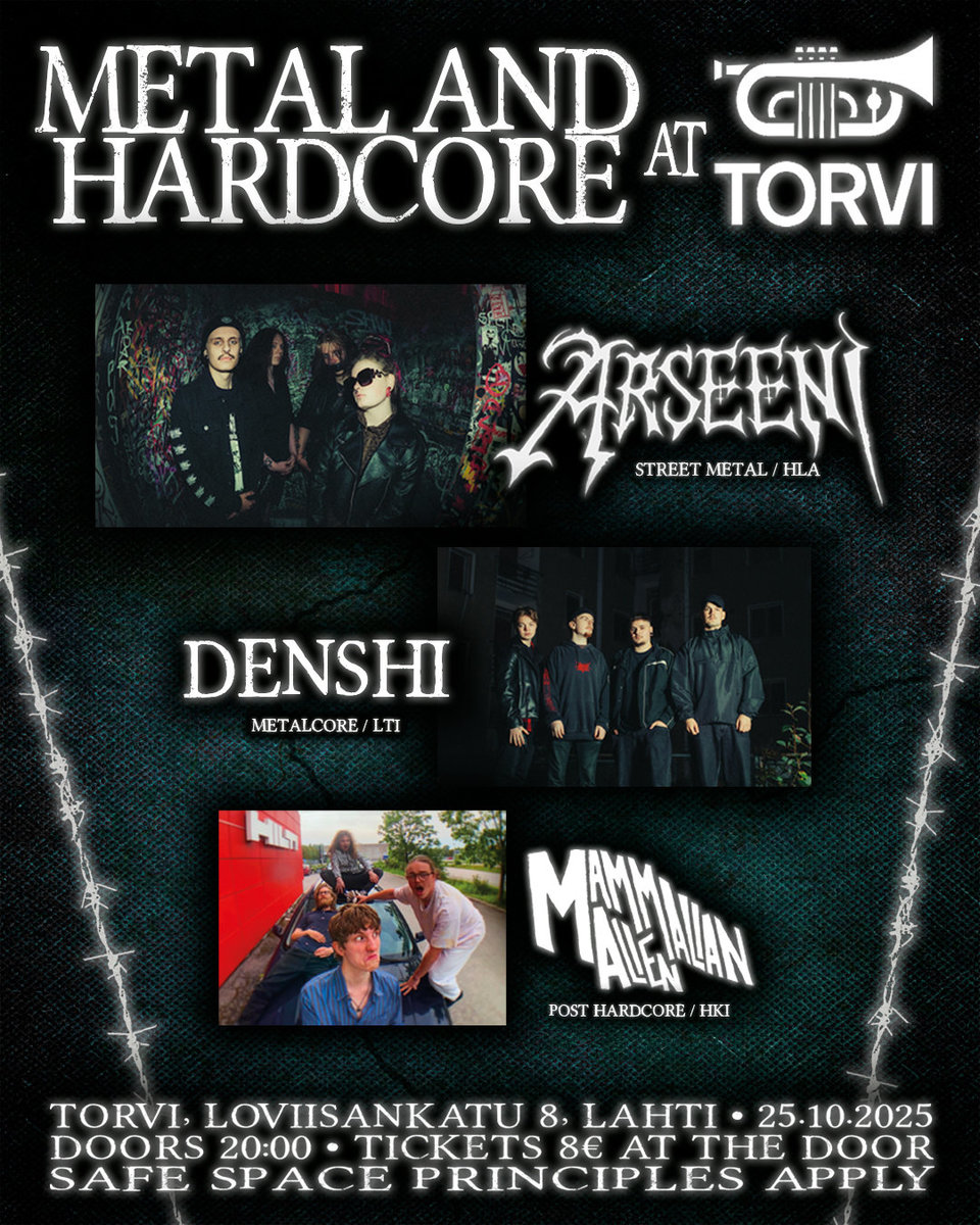 Lisätietoja: | Metal and hardcore music at Ravintola Torvi! Arseeni (Street metal / Hla) Denshi (Metalcore / Lti) Mammalian Alien (Post Hardcore / Hki) Torvi, Loviisankatu 8, Lahti 25.10.2025 Doors 20:00 Tickets 8¤ at the door Safe space principles apply |