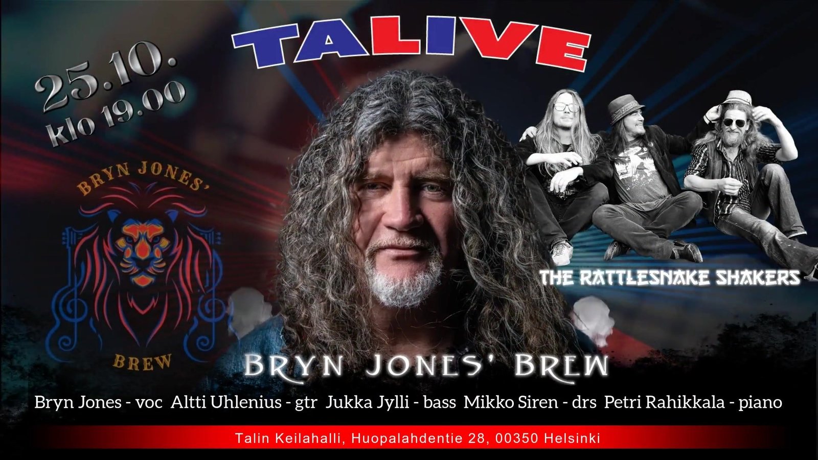 Lisätietoja: | Bryn Jones' Brew tarjoaa americanaa bluesin ja juurevan rock 'n' rollin muodossa. Bändin kappaleet käsittelevät rockin rakennuspalikoita, kuten rakkautta, menetystä, iloa ja surua. Musiikkityylit liikkuvat luonnollisesti country reggaen, honky-tonkin ja rock'n'rollin välillä edustaen siten täsmälleen sitä klassisen rockin perinnettä, jossa genren rajat hämärtyvät hyvän musiikin ja tarttuvien kappaleiden voimalla. Bryn Jones' Brew deliver an Americana flavored, bluesy, rootsy rock 'n' roll. The band's songs deal with the building blocks of rock, such as love, loss, joy and sadness. The musical styles naturally move between country reggae, honky-tonk and rock'n'roll, thus representing exactly the tradition of classic rock, where genre boundaries are blurred by the power of good music and catchy songs. The Brew is: Bryn Jones (Los Bastardos Finlandeses) - vocals, guitar Altti Uhlenius (Everybody) - guitar Jukka Jylli (Kingston Wall) - bass Mikko Siren (Apocalyptica) - drums Petri Rahikkala - piano Bryn Jones´ Brewn lämppärinä soittaa The Rattlesnake Shakers klo 19:00, Bryn Jones Brew n. klo 20:30 Liput: https://www.ticketmaster.fi/event/talive--bryn-jones-brew-lippuja/157410187 |