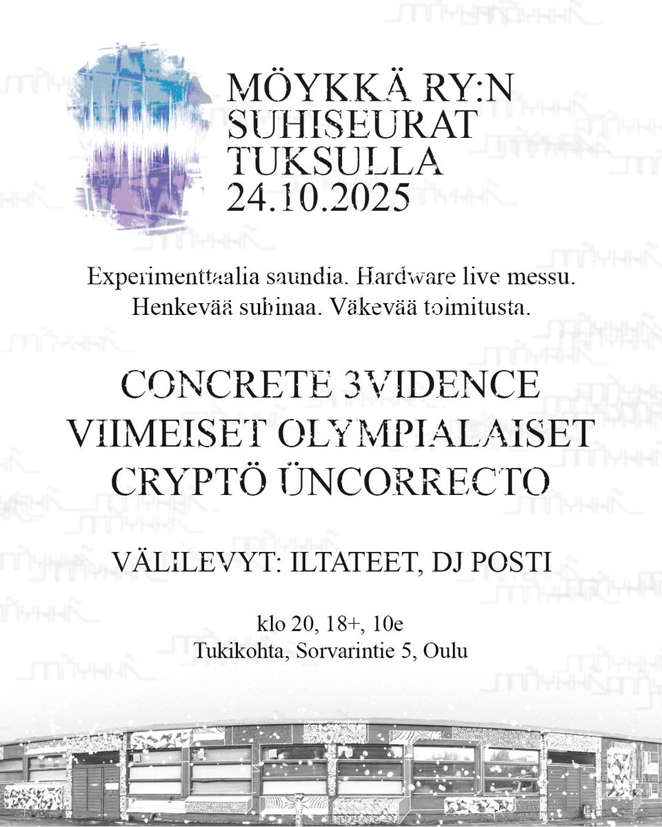 Lisätietoja: | Möykkä ry esittää: SUHISEURAT Henkevää suhistelua koettavissa Tukikohdalla 24.10. Illan aikana aaltoillaan syvän synarapistelun ja kauniiden melodioiden välisillä taivaskanavilla. Kanttorien suhinoiden välissä levykäisiä soittelevat Möykän suntiot; iltateet ja DJ POSTI Tarkemmat infot löytyy Möykkä ry:n instagrammista; https://www.instagram.com/moykka_ry/ |