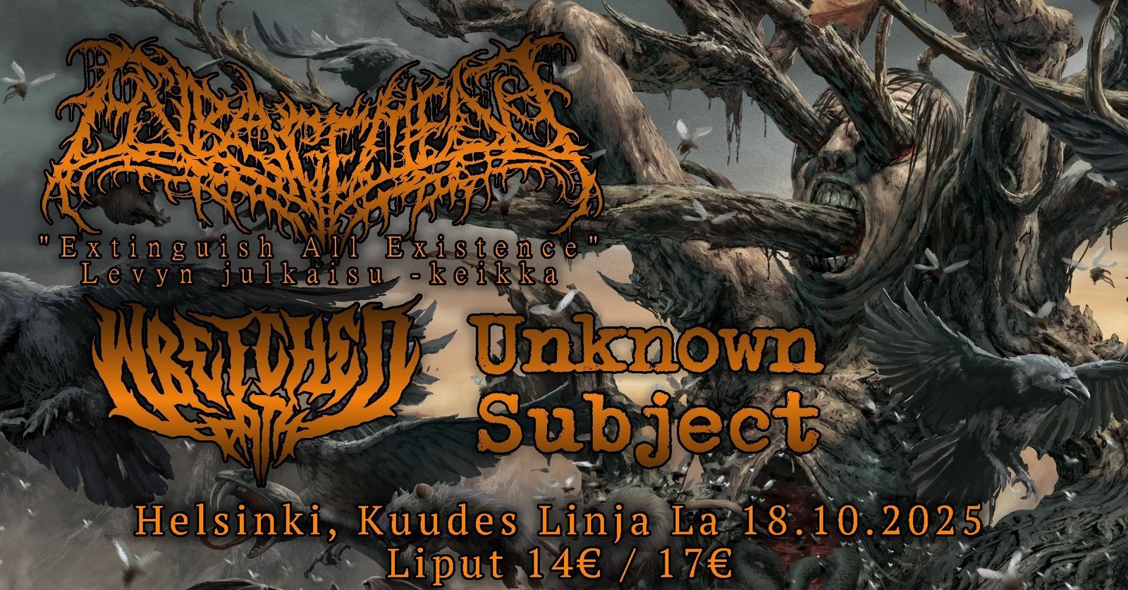 Lisätietoja: | Lauantaina 18.10. Kutosen lattia tärisee brutaalin tiukan kattauksen kanssa, kun kansa pääsee juhlistamaan Enragementin neljättä albumia! La 18.10.2025 Helsinki, Kuudes Linja / K-18 Enragement (levyjulkkarit) Unknown Subject Wretched Path Liput: https://www.tiketti.fi Enragement Neljännen täyspitkänsä julkaiseva Enragement sävyttää brutal death metallia technical-, slamming- ja blackened-vaikuitteilla sekä kolmen vokalistin örinöillä, kärinöillä ja kurlutuksilla. Genrerajat rikkovalla lähestymistavallaan bändi luo biisejä, joissa itseään toistava monotonisuus on kaukana, mutta äänimaailman äärirajat lähellä. Enragement on tunnettu räjähtävistä live-vedoistaan niin kotimaan kuin Euroopan keikkalavoilla. Unknown Subject Unknown Subject on Jyväskylässä päämajaansa pitävä yhtye, jonka ulosanti on tyylipuhdasta, riffivetoista death metallia. ja vaarallisia välispiikkejä on luvassa tälläkin kertaa. Wretched Path Wretched Path on viisihenkinen murharyhmä Etelä-Suomesta. Bändin musiikissa yhdistyvät perinteinen ja moderni death metal aggressiivisesti ja koukuttavasti. Vuonna 2020 perustetussa bändissä on kokeneita muusikoita mm. bändeistä Pestigore, Warmen, Godsplague ja Born of Thorns. Maaliskuussa 2025 bändi julkaisi odotetun toisen albuminsa "Sea Of Death", joka mm. nostettiin julkaisuviikollaan Imperiumissa viikon levyksi! Loppuvuosi 2025 kuluu keikoilla ja työstäessä seuraavaa levyä, jonka materiaali on pitkälti valmiina. |