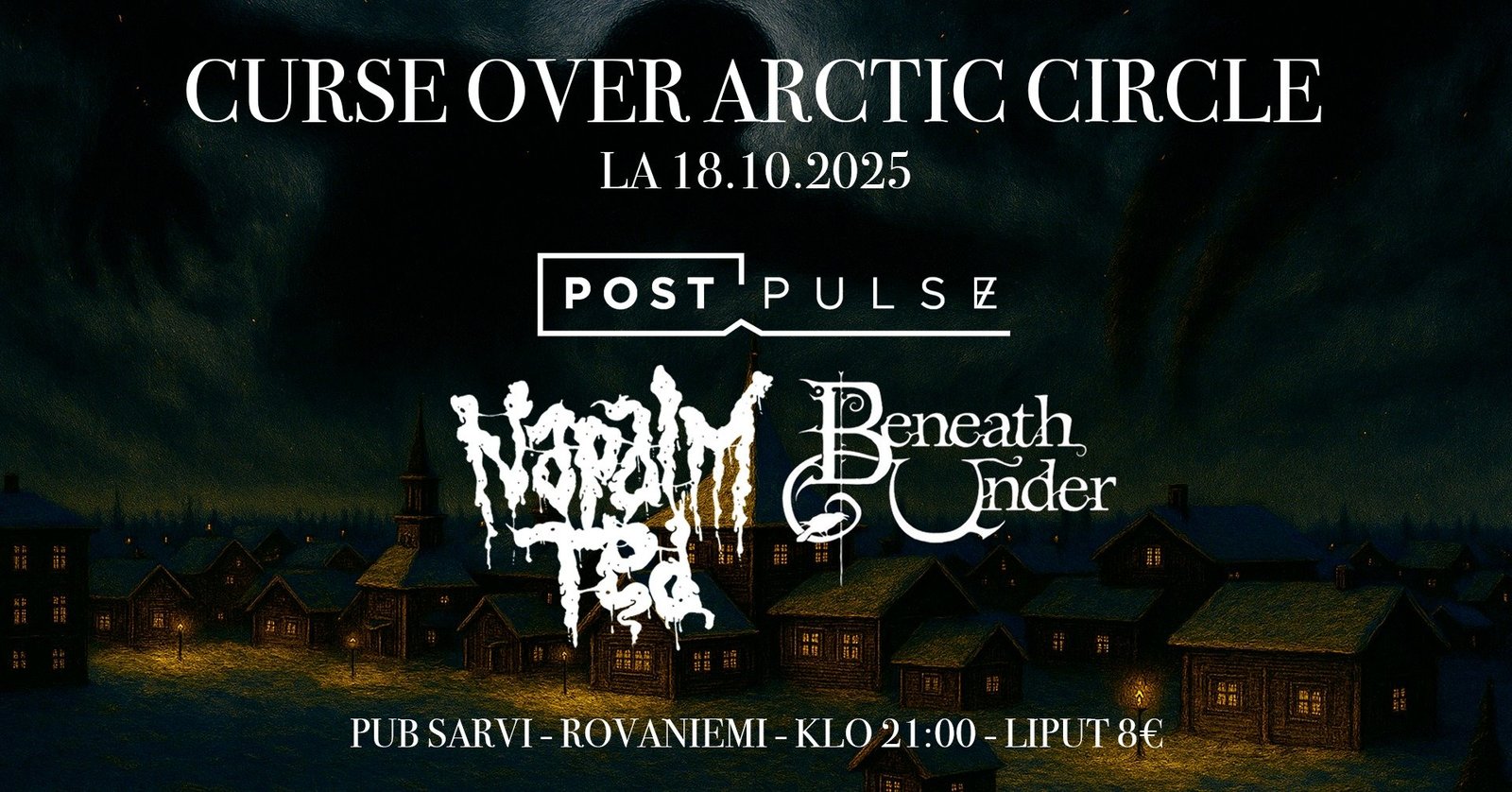 Lisätietoja: | CURSE OVER ARCTIC CIRCLE tuo lokakuussa Sarveen kolme metallin eri kerroksilla operoivaa yhtyettä: Post Pulse, Napalm Ted ja Beneath Under POST PULSE Post Pulse on helsinkiläinen melodeath jyrä, joka julkaisi kehuja keränneen toisen albuminsa Return to the Halls 2024 keväällä. Bändin kokoonpano on säilynyt samana vuodesta 2015 lähtien ja he ovat tällä hetkellä äänittämässä kolmatta albumiaan. On kuitenkin aika pyyhkäistä studiopölyt soittimista ja tuoda bileet ensimmäistä kertaa Rovaniemelle. NAPALM TED Tämä oululainen grind-death-hirviö ei paljon esittelyjä kaipaa - turpaan tulee ja kovaa, kun Napalm Ted hönkii ytimekkäitä purkauksiaan sarjatulella!! Mikä voisi mennä vikaan, kun trio virittää ilmoille kappaleita kuten Soup Eternal, Corpse Tower, Meat Master tai Eaten by Pigs - ei yhtikäs mikään! BENEATH UNDER Beneath Under on Rovaniemellä 2005 aloittanut metalliyhtye joka ei kategorisoi omaa musiikkiaan mihinkään tiettyyn alagenreen. Yhtyeen musiikista löytyy viitteitä monista alagenreistä ja tästä yhtye ei tingi, kun biisejä tehdään. Viiden hengen porukka on kerennyt keikkailla aina Nummirockista Jalometallin. Nyt vihdoin yhtye pääsee esiintymään pub Sarvessa. Tule paikalle todistamaan yhtyeen riehakasta lavaesiintymistä ja liity siihen itse myös mukaan! https://www.facebook.com/postpulse https://www.facebook.com/napalmted https://www.facebook.com/beneathunderband Aikataulu: 21:00 Beneath Under 22:10 Napalm Ted 23:20 Post Pulse Liput ovelta 8¤ |