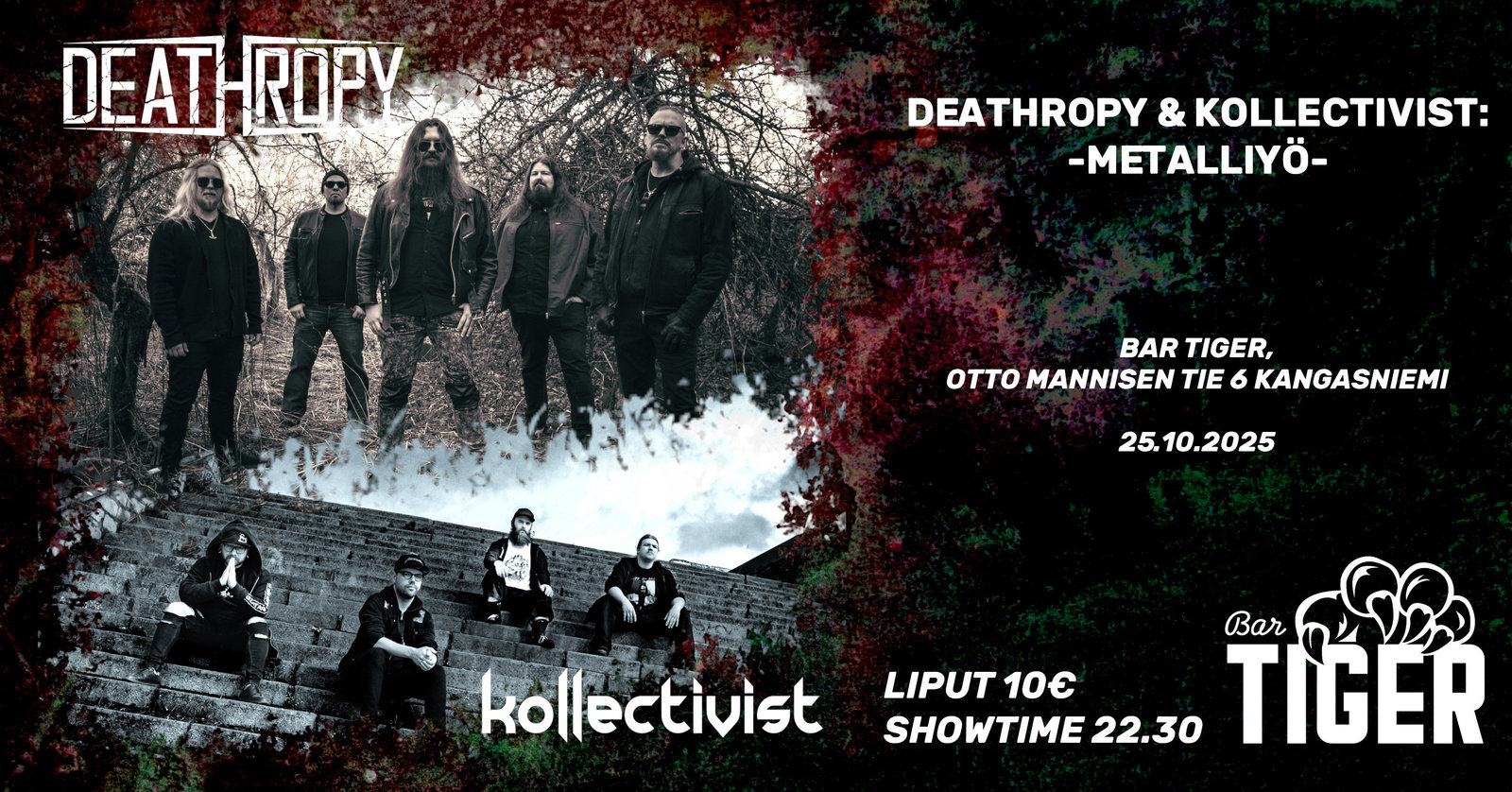 Lisätietoja: | Bar Tigerin metalliyö tarjoilee raskaan annoksen metallia Kangasniemelle, sillä lavalle nousevat Kollectivist (Lahti) sekä Deathropy (Mikkeli) Illan avaava Kollectivist on lahtelaislähtöinen nelikko, joka soittaa modernia metallia hyvin raskaalla melodeath- ja progeotteella. Vuodesta 2017 asti aktiivisesti keikkaillut yhtye osaa ottaa yleisönsä, eikö tule jättämään ketään kylmäksi. Illan päättää mikkeliläinen melodeath rykmentti Deathropy, jonka edellinen vierailu Tigerissä oli lähes maaginen. Deathropy on juuri keikan korvilla julkaisemassa uutta musiikkia, jota myös keikalla tullaan kuulemaan. Showtime: 22.30 Liput: 10¤ |