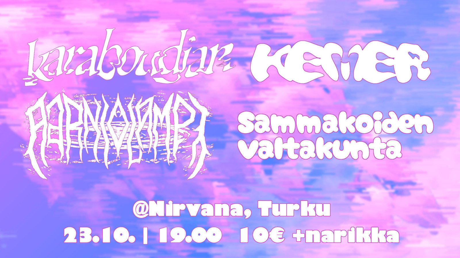 Lisätietoja: | Neljä toinen toistaan hurjempaa yhtyettä tuo torstai-iltaan häkellyttävän live-musiikkimyrskyn. Luvassa suuria tunteita, perverssiä progeilua, tajunnan musertavia riffejä, lennokasta improvisaatiota ja ennen kaikkea kunnon meininkiä! Aarniolampi: Aarniolampi tuo 70-luvun progen draaman ja leikkisyyden nykypäivään yhdistämällä villin genre-ilottelun ja koukeroiset kappalerakenteet tunteellisesti latautuneeseen tulkintaan. Sanoituksissaan yhtye maalailee melankolisia unikuvia, mutta lavalla improtaan ja jorataan kuin viimeistä päivää. Debyyttisinkku Marras saatavilla suoratoistoissa kautta maan! https://instagram.com/aarniolampi https://linktr.ee/aarniolampi Kemer: HELSINKI ROMANTIC POST-WAVE. Tahmeita grooveja ja Mielenkiintoinen mielenmaisema. Kemer hyökkää viiden hengen voimin kuulijan kosmiseen ylätajuntaan. Yhtye yhdistelee uuden aallon pitkän hännän alta kaikkea hyväksi näkemäänsä, joskus myös kuulemaansa. Tästä muodostuu pääkaupunkiseudulla jo pieneksi ilmiöksi muodostunut saundi. Tule selvittämään mistä on kyse. Vaik snögee stikkaa ni styget skulaa! Karaboudjan: Karaboudjan on turkulainen psykerock-bändi, jonka musiikki on kaunis yhdistelmä haikeita melodioita ja raskaita tajuntaa raapivia stoner-riffejä. Karaboudjan elää vahvasti hetkessä ja keikalla improvisaatio on suuressa roolissa. Karaboudjan vie kuulijansa psykedeeliselle tutkimusmatkalle kohti tuntematonta ja synkkää, mutta myös lämmintä ja unenomaista kesäiltaa. Julkaisemme debyyttialbumimme syksyllä Sammakoiden valtakunta: Sammakoiden Valtakunta on helsinkiläinen trio, jonka musiikissa rokkiin yhdistyy ripaus bluesia sekä psykedeliaa. Mystiikka korostuu Sammakoiden Valtakunnan suomenkielisissä sanoituksissa, luoden sielukkaan tunnelman yhtyeen musiikkiin. Perinteisen ja rehdin särön lisäksi myös tiukalta groovelta ja paksulta bassolta on mahdotonta välttyä. Ovet 19:00. Liput ovelta 10¤ + narikka. Liput ennakkoon 8¤: https://tinyurl.com/5n6eya36 Ikäraja K18. |
