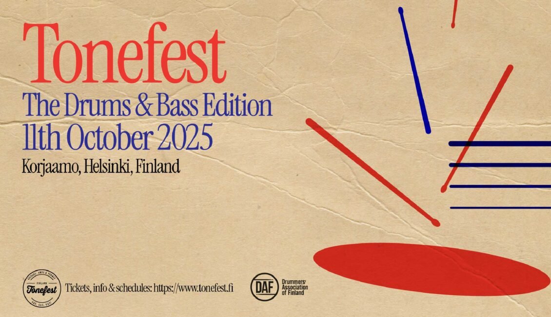 Lisätietoja: | Pearl Masterclass klinikka klo 15-16 Liput: Ennakkoon lippu.fi:stä 17,6 ¤ / ovelta 18 ¤ DAFin jäsenille ovelta 15 ¤ jäsenkortilla Lapset alle 15 vuotta maksutta https://korjaamo.fi/event/tonefest-drums-bass-edition/ https://smi-music.com/blogs/news/drum-bass-tonefest-ukri-suvilehto-pearl-masterclass-11-10-helsinki |