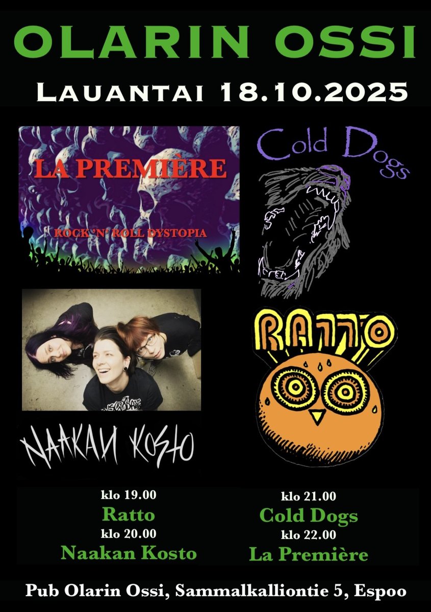 Lisätietoja: | Olarin Ossissa kovaa menoa lauantaina 18. lokakuuta! Klo 19 Ratto Klo 20 Naakan Kosto Klo 21 Cold Dogs Klo 22 La Première Liput 5¤, tervetuloa! Pub Olarin Ossi, Sammalkalliontie 5, Espoo |