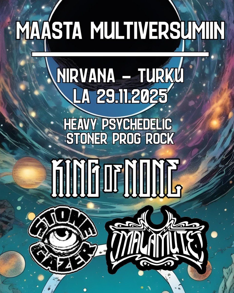 Lisätietoja: | Liput 8/10¤ Ovet 21:00 KING OF NONE Heavy stoner rockia Helsingistä. MALAMUTE Turkulaista rock/metal/prog/stoner musaa. STONEGAZER Gruuvaavaa raskasta stoner rockia Tampereelta. |