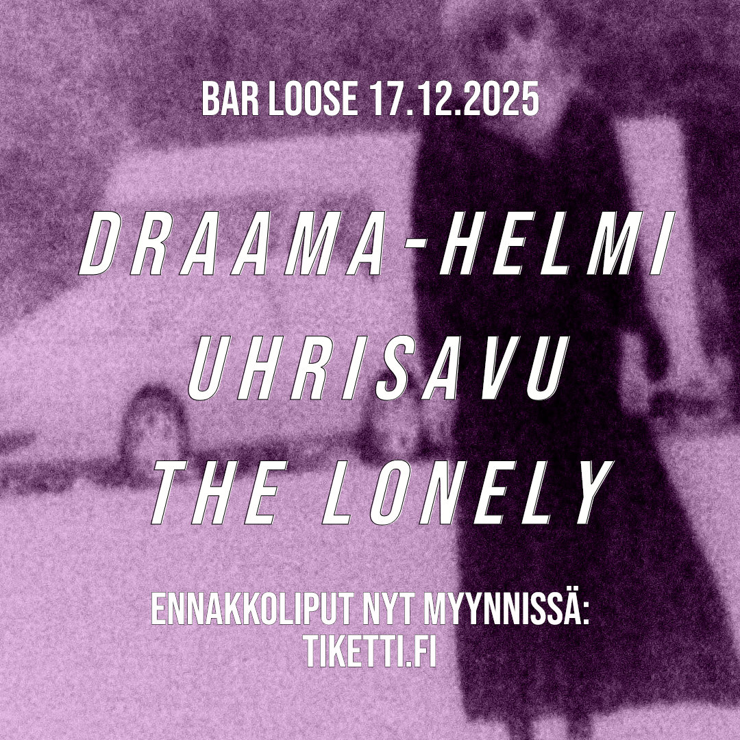 Lisätietoja: | Bar Loosessa nautitaan kolmen tummasävyisen artistin omaäänisestä indiemusiikista, kun lavalle nousevat Draama-Helmi, Uhrisavu ja The Lonely. Draama-Helmi esittää synkkätunnelmaista räppiä kokeellisten taustojen päälle. Morbidi kolmas sooloalbumi ”Draama-Helmi kuistilla” voitti keväällä 2023 Teosto-palkinnon ja kriittikkojen mielestä Draama-Helmi on levyllä ”ankarampi kuin koskaan”. Viime aikoina Draamis on ollut keikkatauolla ja keskittynyt tekemään Kuupuun kanssa yhteislevyä, joka ilmestyy keväällä. Nyt ohjelmassa on paluu tauolta esiintymään Loosessa. https://draama-helmi.bandcamp.com/…/draama-helmi-kuistilla Tamperelainen Uhrisavu hakee vahvasti inspiraationsa niin menneisyydestä kuin tulevaisuudestakin. Musiikillisesti mieleenpainuvassa kokonaisuudessa yhtye yhdistää 80-luvun post-punk-yhtyeitä sekä varsinkin itäeurooppalaista synkkyyttä ja estetiikkaa. Suomalainen melankolia tiivistyy intensiivisissä live-esityksissä. https://uhrisavu.bandcamp.com/track/kanna-minut-pois The Lonely on helsinkiläinen indierock-trio, jonka musiikissa voi kuulla vaikutteita mm. synapopin ja post-punkin äänimaisemista, kenties myös shoegaze-suristelusta. Yhtye kuitenkin jättää oman musiikkinsa genrelokeroinnin kuulijan vastuulle. The Lonely on julkaissut omakustanteisen EP:n 2024 ja “Seabed”-EP ilmestyi syyskuussa 2025. https://thelonelyhel.bandcamp.com/ www.barloose.com Annankatu 21 Ikäraja: K-18 Aika: Ovet klo 20:30 Ovella peritään eteispalvelumaksu 3,50 ¤. Ennakkoliput: https://www.tiketti.fi/draama-helmi-uhrisavu-the…/112913 Liput ovella 11 ¤, mikäli jäljellä. |