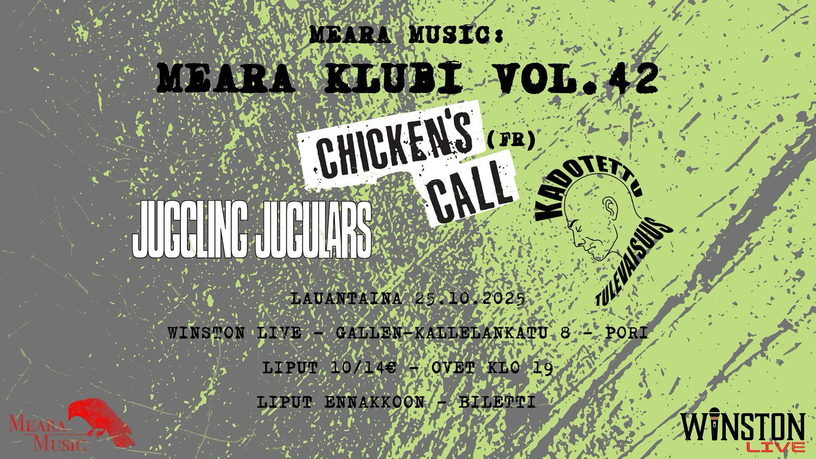 | Lisätietoja: | Lauantaina 25.10.2025, Meara Klubi Vol. 42, Winston Live, Gallen-Kallelankatu 8, 28100 Pori. Esiintyjinä: Chicken’s Call (Ranska), Juggling Jugulars sekä Kadotettu Tulevaisuus. Liput 10/14¤. Liput ennakkoon: https://biletti.fi/e/meara-klubi-vol-42-pori. Ovet klo 19. Happy Hour klo 19-20. Showtime klo 20. K-18. |