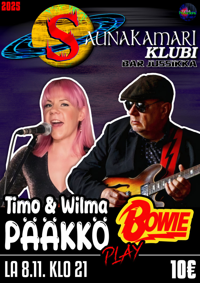 | Lisätietoja: | Timo ja Wilma Pääkkö tulkitsevat David Bowien laajaa tuotantoa lämminhenkisesti ja omalla otteellaan. Setti rakentuu pääasiassa Bowien legendaarisen 1970-luvun kappaleista — ajanjaksosta, jolloin syntyivät monet hänen ikonisimmista teoksistaan. Illan kruunaa special guest star Tumppi Vähä-Pesola, joka tuo kokonaisuuteen sävyjä pianon ääreltä. Timo Pääkkö - laulu, kitara Wilma Pääkkö - taustalaulu Tumppi Vähä-Pesola - piano Liput 10 ¤ Ennakko Jussikasta. Puhelimella varatut liput lunastettava viimeistään päivää ennen keikkaa. Showtime 8.11.2025 klo 21-23. Bar Jussikka, Yrjönkatu 10 Pori |