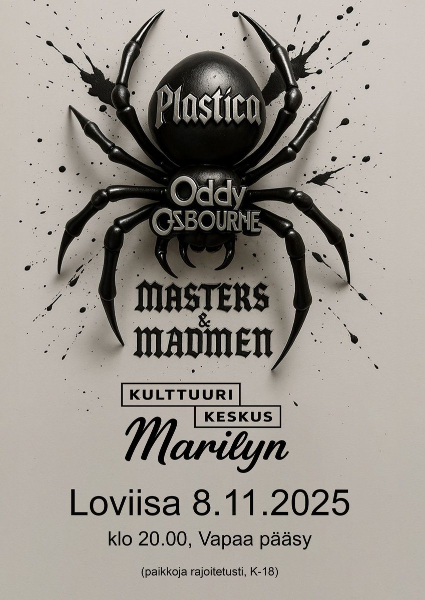 | Lisätietoja: | MASTERS & MADMEN: Tribute night - ODDY OSBOURNE (plays Ozzy Osbourne) - PLASTICA (plays Metallica) Oddy Osbourne ja Plastica löi hynttyyt yhteen, jonka seurauksena syntyi Masters & Madmen-tribuuttishow. Tapahtuma saa ensi-iltansa Loviisan Kulttuurikeskus Marilynissa 8.11.2025. Tapahtumassa esiintyy Oddy Osbourne, joka tekee kunniaa Ozzy Osbournen uralle sekä elämälle, ja Plastica, joka tulkitsee Metallicaa energisellä ja areenakeikoille uskollisella otteella. Ajankohta: Lauantai 8.11.2025 Paikka: Kulttuurikeskus Marilyn, Loviisa Showtime: 20.00 Ikäraja: K18 Sisäänpääsy: ILMAINEN |
