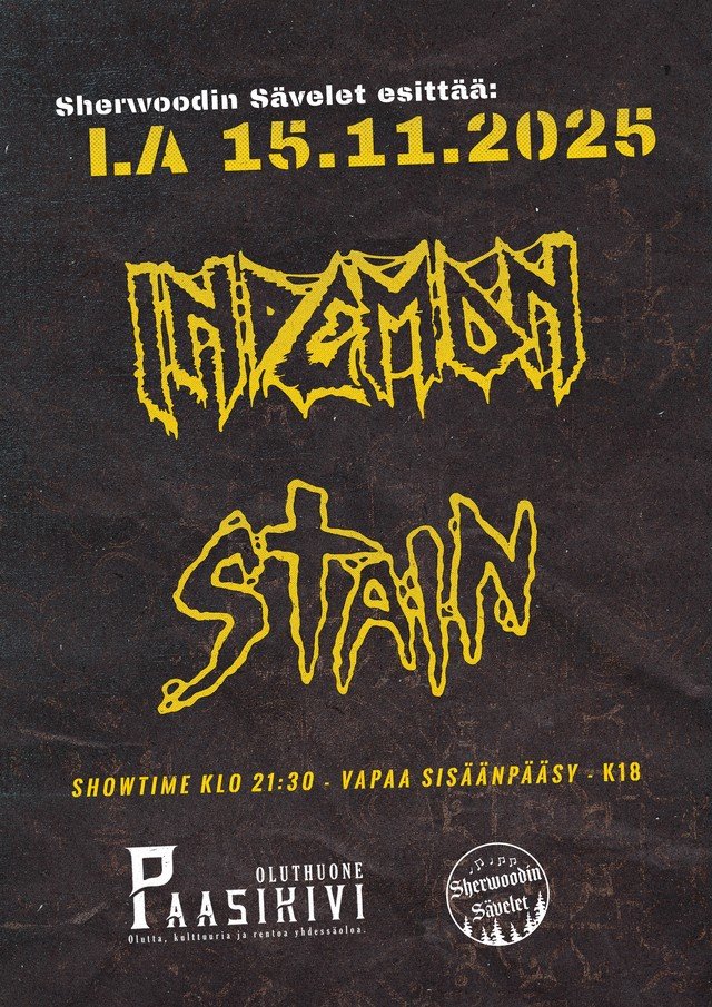 | Lisätietoja: | Sherwoodin Sävelet esittää: LA 15.11.2025 Indemon Stain Indemon on vuonna 2020 perustettu nelihenkinen metalliyhtye Keravalta. Yhtye julkaisi kehutun Fear of Living-EP:n alkuvuodesta 2022 ja jatkaa nyt uudella täyspitkällä albumillaan Reclaiming Chaos, joka vie yhtyeen soundia entistä raaempiin ja monikerroksisempiin ulottuvuuksiin. Yhtyeen jäsenet ovat kokeneita hahmoja keravalaisen metallikulttuurin syvistä syövereistä, ja Indemonin musiikissa korostuvat tarkka yhteissoitto, näkyvä intensiteetti ja konstailematon yhteys yleisöön. STAIN on vuonna 2017 perustettu sludge/doom-yhtye Sulan alueelta. Yhtye on julkaissut kaksi EP:tä ja kolme split-singleä. Yhtye keskittyy primitiivisen hitaaseen, äärimmäisen raskaaseen ilmaisuun. STAIN on tehnyt monia esiintymisiä Suomessa, mutta käynyt soittamassa myös Virossa ja Latviassa. Keikkapaikkana toimii Oluthuone Paasikivi osoitteessa Paasikivenkatu 4, Kerava. Ikäraja 18, vapaa pääsy. Soitto alkaa klo 21:30. Tervetuloa keikalle! |