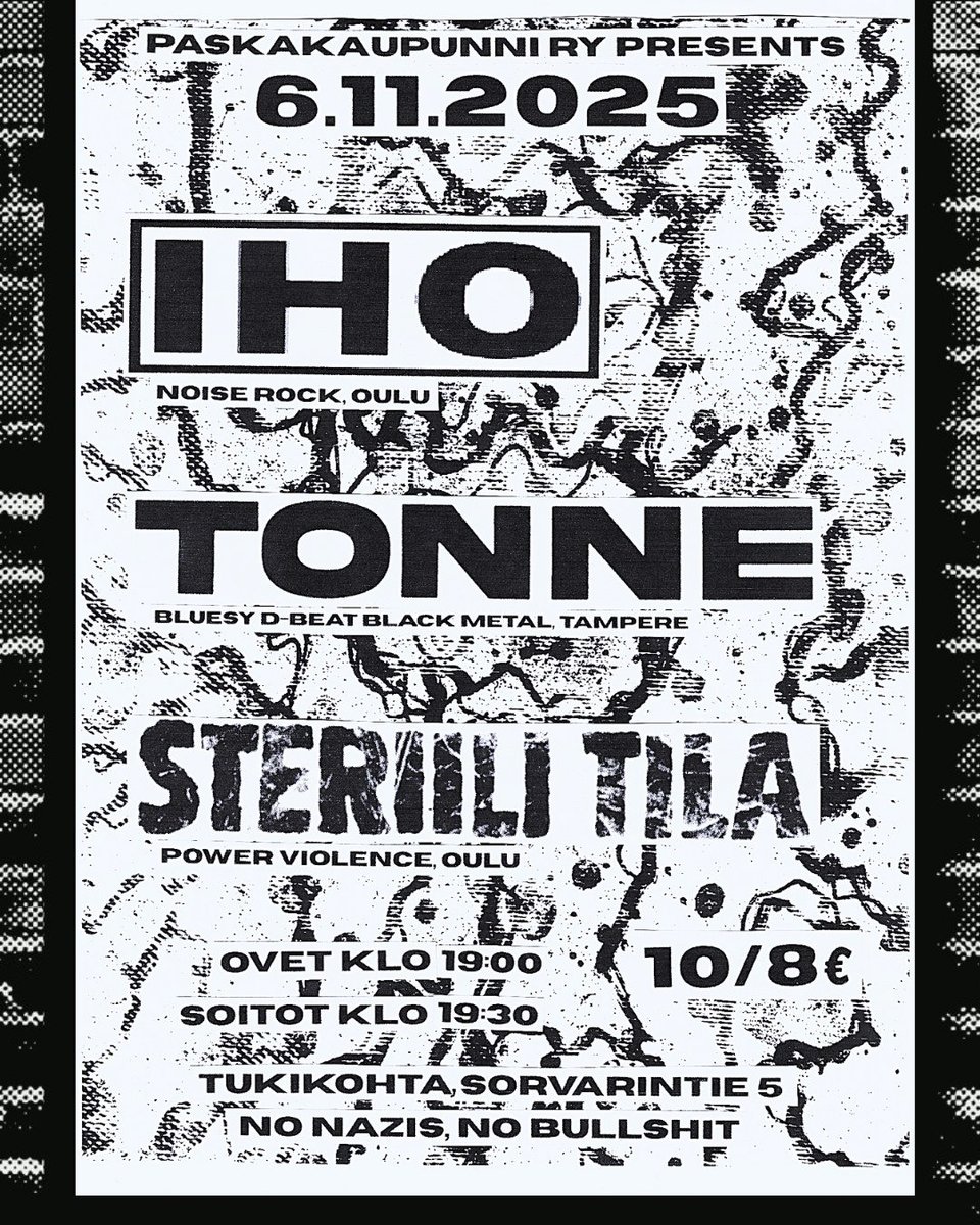 | Lisätietoja: | Voi juku mikä torstai! IHO ja TONNE lähtevät viikonlopuksi Ruotsiin ja lämmöt reissulle otetaan tottakai Steriili Tilan kanssa 6.11. Tukikohdalla! IHO - Noise rock, Oulu https://ihonoise.bandcamp.com TONNE - Bluesy d-beat black metal, Tampere https://tonneblast.bandcamp.com/ STERIILI TILA - Powerviolence, Oulu https://steriilitila.bandcamp.com/ Liput 10/8¤ (alennus Paskakaupunni ry:n jäsenille) Tapahtumassa käy Kaikukortti Lipunmyynti aukeaa 19:00, soitot 19:30 eteenpäin. Tarkempi aikataulu ilmoitetaan myöhemmin. Tukikohdalla noudatetaan turvallisemman tilan periaatteita – kaikki Tukikohdan toiminta on syrjinnästä ja ahdistelusta vapaata aluetta. Tukikohdalla sitoudutaan kohtelemaan kaikkia yhdenvertaisesti henkilön sukupuolesta, iästä, etnisestä alkuperästä, uskonnosta tai vakaumuksesta, mielipiteestä, terveydentilasta, vammaisuudesta tai seksuaalisesta suuntautumisesta riippumatta. Jokaisella on oikeus oleskella Tukikohdalla ilman, että joutuu häirinnän, ahdistelun, loukkaavan kielenkäytön tai väkivallan kohteeksi. See less  |