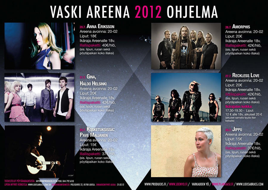 Lisätietoja: | Showtimes: 21:00 Gina 23:00 Haloo Helsinki! Liput 20¤ VASKI AREENAN OHJELMA JA AIKATAULUT: 20. - 28.07.2012. PE 20.07 ANNA ERIKSSON. LIput 18¤ LA 21.07: GINA & HALOO HELSINKI 20¤ SU 22.-TI 24.07 HALLI SULJETTU KE 25.07 KOSKETUKSISSA: PAVE MAIJANEN. Liput 15¤ TO 26.07 AMORPHIS. Liput 20¤ PE 27.07 RECKLESS LOVE IKÄRAJATON KLO 17:30-19:30 LIPUT 12¤ (ALLE 18V., MUUT 20¤. 20¤ LIPULLA MYÖS ILLAN KEIKALLE PE 27.07 RECKLESS LOVE (support: coverdrive). Liput 20¤ LA 28.07 JIPPU. Liput 15¤ |
