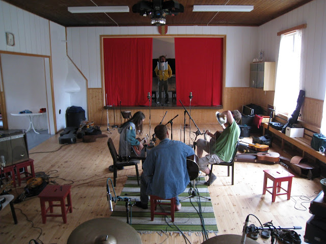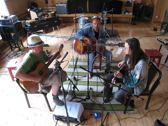 Mä äänitin edelliskesänä oman bändini levyn, jossa pohjasoitoissa oli rumpujen kanssa samassa tilassa nailonkielinen akustinen ja vaihtelevasti mandoliini/teräskielinen/banjo sekä akustinen basso tosin vahvistimen kautta soitettuna ja mikitettynä. Tilanne näytti tältä: