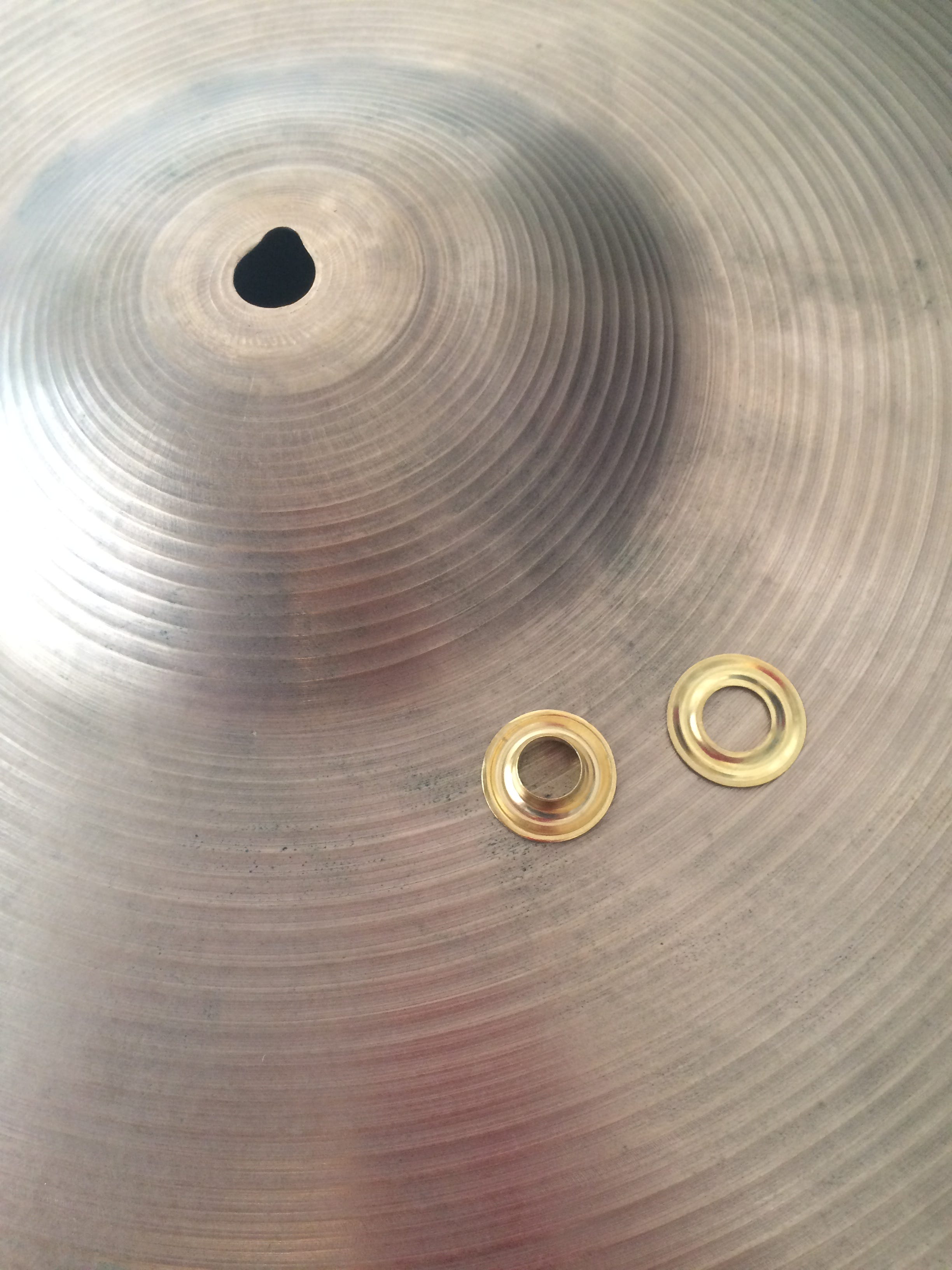 Jos olisi ihan pakko laittaa joku, niin laittaisin samanlaisen (messinkisen) yksiosaisen läpivientirenkaan (eyelet), jota käytetään badgeissa. Asennus niin, että kupu on alaspäin jollain sopivalla alustalla (nahka, puu...) ja kuulalla tai ihan pienellä pallopäävasaralla lähtisin levittämään rengasta ja takoisin sen kupua vasten symbaalin alapuolelta. Soundit, piuhat ja kajarit. |