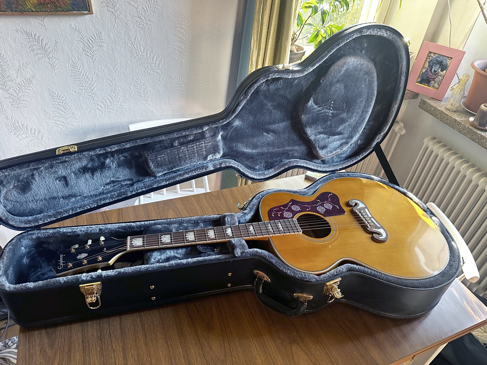 Vuonna 2022 ostettu, uudenveroinen Epiphone J-200 Masterbilt alkuperäisellä Epiphonen kovalla kotelolla. Kaunis kuin mikä, ja soi hienosti - ei vaan ole ollut aikaa/innostusta soittamiseen ja nyt ollut vain keräämässä pölyä viimeiset pari vuotta. Säilytetty aina omassa kotelossaan. Indonesiassa tehty malli. Sijaitsee Turussa, kulkeutuu Tku-Hki välillä myös tarvittaessa. Ostajan vastuulla myös Matkahuolto mahdollinen. Ei vaihtoja. https://reverb.com/en-fi/item/72036 … ne-j-200-aged-natural-antique-gloss Speksit: Design: Super jumbo Top: Solid sitka spruce Back & Sides: Solid flamed maple 2-Piece neck: Maple with mahogany centre strip Fretboard: Indian laurel Fretboard inlays: Mother-of-pearl graduated crowns Back with centre strip 6-Ply top binding 4-Ply back binding Neck profile: Rounded C Scale: 649 mm (25.551") Nut width: 43 mm (1.693") Nut: Bone 20 Frets Pickup system: Fishman Sonicore with controls for volume and tone in the sound hole Bridge: J-200 Moustache Machine heads: Gold Epiphone Deluxe with Keystone buttons Colour: Aged Antique Natural High-Gloss Hinta: 900 € | |