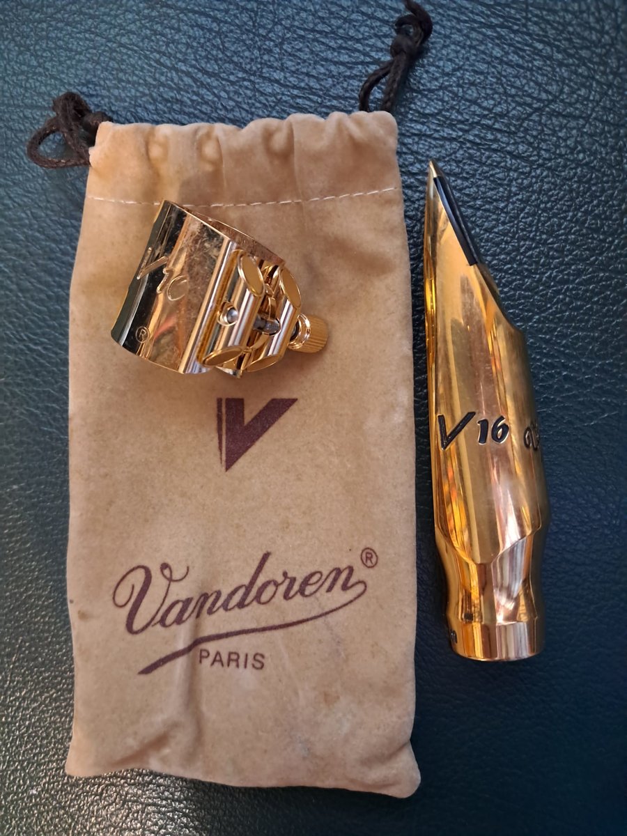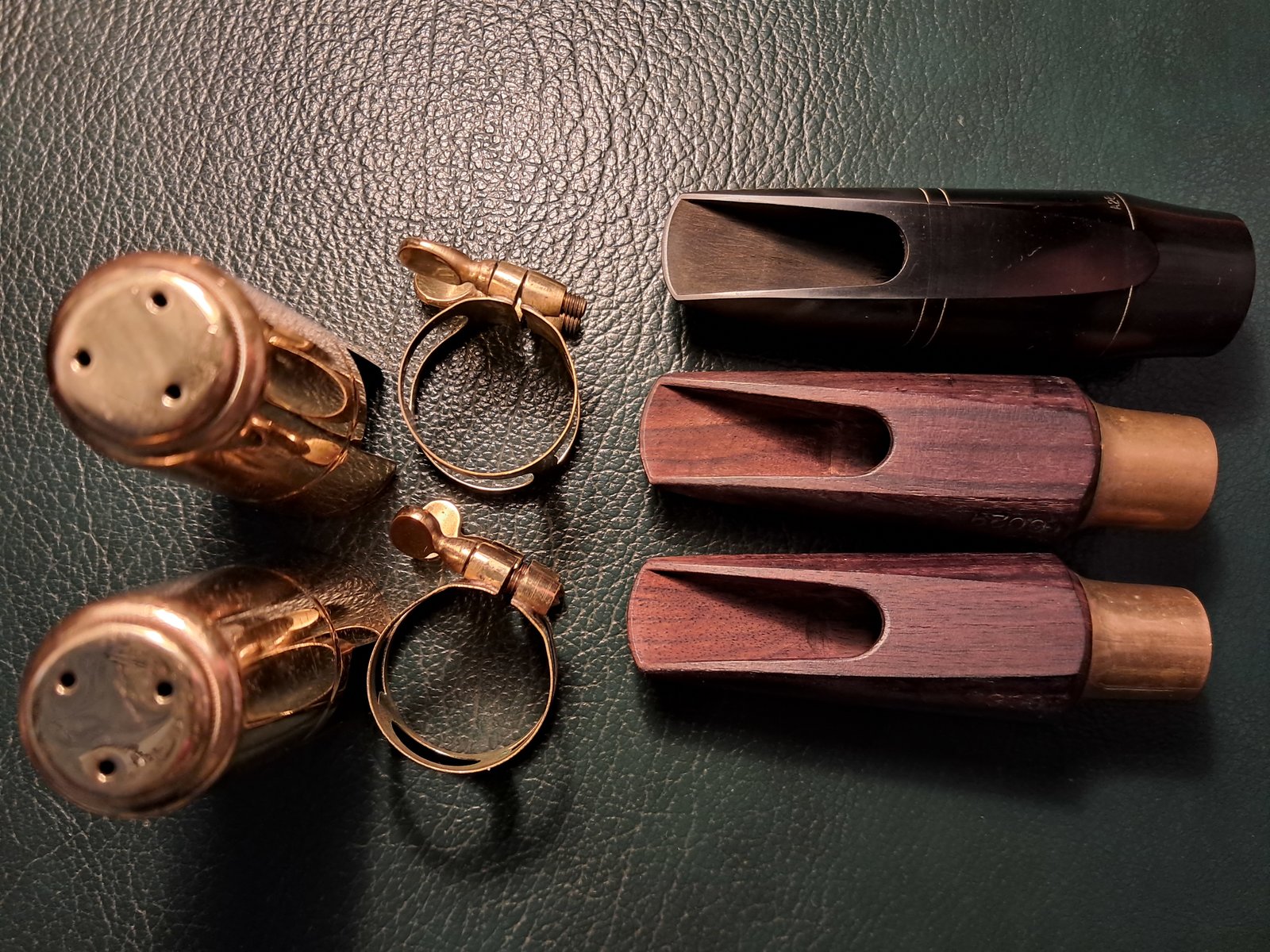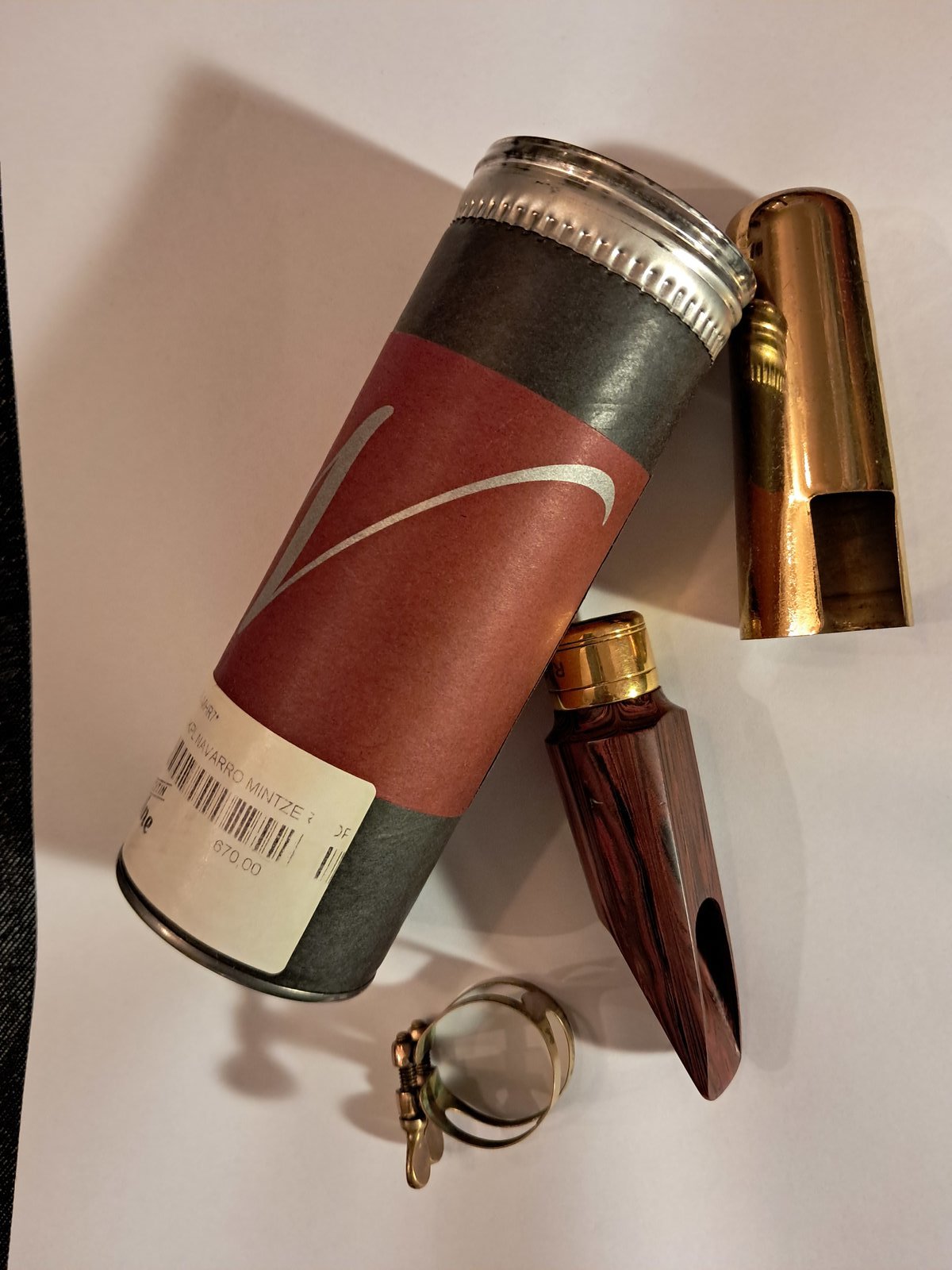 Peter Ponzolin käsintekemät ebenpuusuuttimet ovat harvinaisia, vain alle sata valmistettu kymmeniä vuosia sitten. Sarjanumero isompiaukkoiselle on 0060 ja pieniaukkoisemmalle 0029. Molemmat ovat virheettömässä alkuperäiskunnossa, vain pientä lehdenkiristimen aiheuttamaa kulumaa voi havaita yläosassa. Pyydän 150 e/kpl tai 250 e molemmat. Vandoren A28 V5 on myös virheetön ja alkuperäinen. Pelkkä suutin. Hintani on 65 e. Vierailen Helsingissä 6. - 13.10. Otan suuttimet mukaan. Katso myös ilmoitukseni tenorisaksofonin suuttimista (Navarro, Vandoren). Hinta: 250 € | |