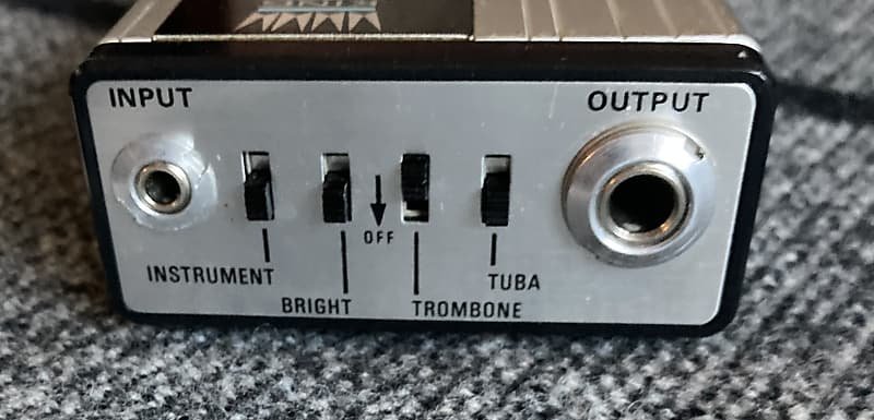 With this 57 years old unit you can turn your trumpet mouthpiece vibrations into trombone-alike and tuba-alike sounds. Great for arranging big band demos with just one trumpet. What is included (see on the photo 3): - Octavoice II Brass, fully working unit with a 9v battery inside - Piezo pickup with a 3.5mm output plug - Bach 3C mouthpiece with a drilled slot for a piezo pickup - 6.35mm - 3.5mm speaker cable - Vintage handmade bag Pick up from Rautatieasema, Pasilan asema, Leppävaaran asema, Keran asema. Cash only. Hinta: 350 € | |