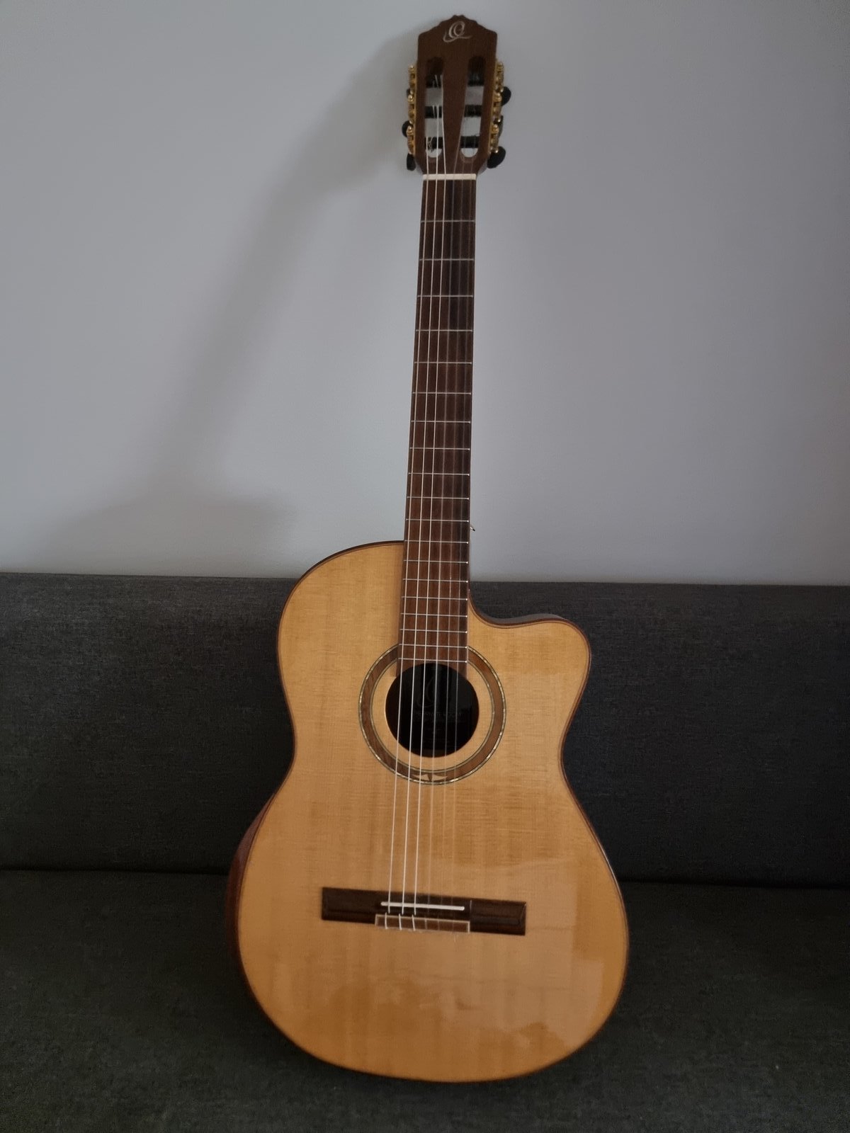 | Todella kaunis ja suoraan sanottuna virheettömässä kunnossa oleva nylonkielinen. Soi hintaisekseen erittäin hyvin ja muutenkin laadukkaan tuntuinen. Mukava soittotuntuma. Toisin kuin useimmissa nylonkielisissä, tässä on kaularauta jotta kaulan saa säädetyksi mieleisekseen, ja on ikään kuin "takuu" siitä, ettei kitaraa joudu viedä ammattilaisen suoristettavaksi 10-15 vuoden päästä mikäli ilmankosteus hyppii ym. Perus hyvä mikitys ja elektroniikka, en ole sitä juuri käyttänyt. Kitara on ollut kotikäytössä. OVH 750¤ huitteilla. Mukaan Ortegan oma kantopussi. Hinta: 430 € | |