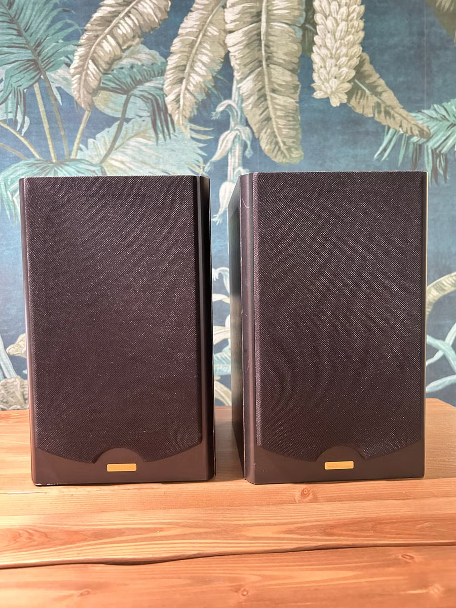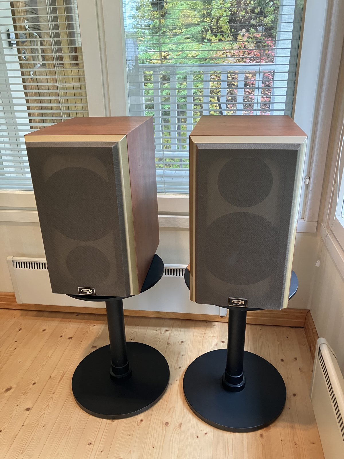Myydään jo vintageikää olevat OR 160Hi kaiuttimet. Valmistettu käsittääkseni joskus vuosituhannen vaihteessa (tai hieman aiemmin) Mikkelissä Olavi Räsäsellä. Tekniikan maailman testivoittaja 2002. Erinomaisessa siitissä kunnossa, hyvin vähän minkäänlaista käytönjälkeä. Pituus 34cm, leveys 22cm, korkeus 38cm. Muut speksit kuvassa/tarrassa kaiuttimen takaa. Kaiuttimien alle mukaan mustat valurautaiset ja erittäin tukevat jalustat - korkeus 39,5cm ja halkaisija 19cm. Nouto Mikkelistä. Hinta: 250 € | |