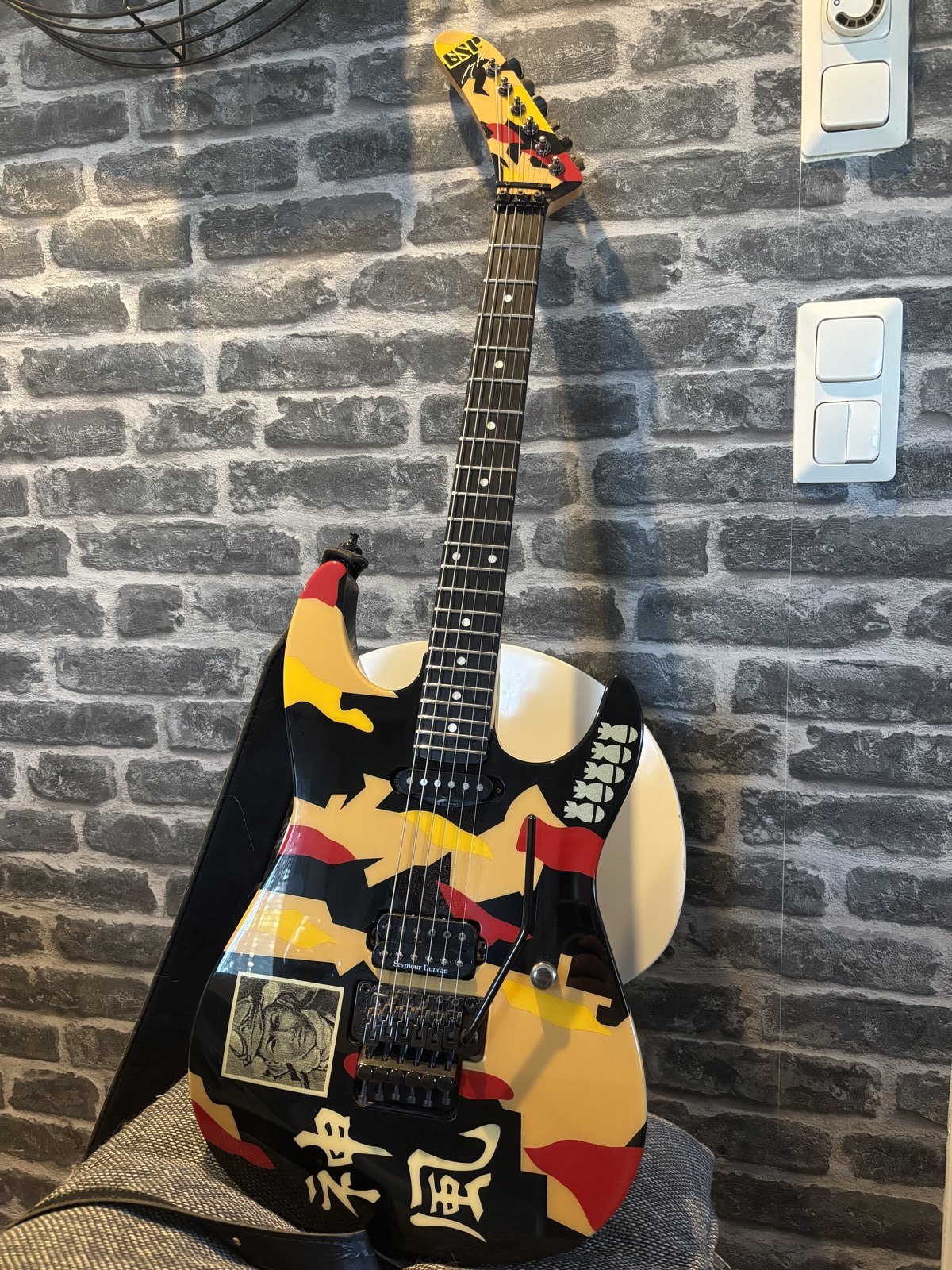 Tästä harvinaisempi ja soittotuntumaltaan arvostettu Japani ESP. Ymmärtääkseni 80-luvun loppupuolelta ja halutusti vielä näitä "pre lawsuit" yksilöitä. Yksilöön on aikanaan lisätty kolmas mikin paikka, joka jää nätisti plektrasuojan alle. Muutostyöstä on kuitenkin jäänyt bodyn etupuolelle ruuvin jättämä jälki. Nauhat ovat jokseenkin kuluneet ja kitara on nähnyt paljon aktiivista käyttöä. Muuten kitara on hyvässä kunnossa. Ulkoasu on muuten tyylikäs ja elektroniikka toimii moitteetta. Testaus vahvarin kanssa onnistuu Joensuussa. Pehmeä laukku mukaan, jonka vuoksi en postittaisi kitaraa. Senverran voidaan tulla vastaan, että sovittuna kulkeutuu Lappeenrantaan tai Kuopioon. Vaihto onnistuu myös saman hintaluokan tai halvempaan hevi-henkiseen kitaraan (ei kelluvaa tallaa). Bassot, pedaalit ja vahvarit harkitaan myös. Mutta ehdota niin katsotaan yksilö kohtaisesti. Hinta: 1000 € | |