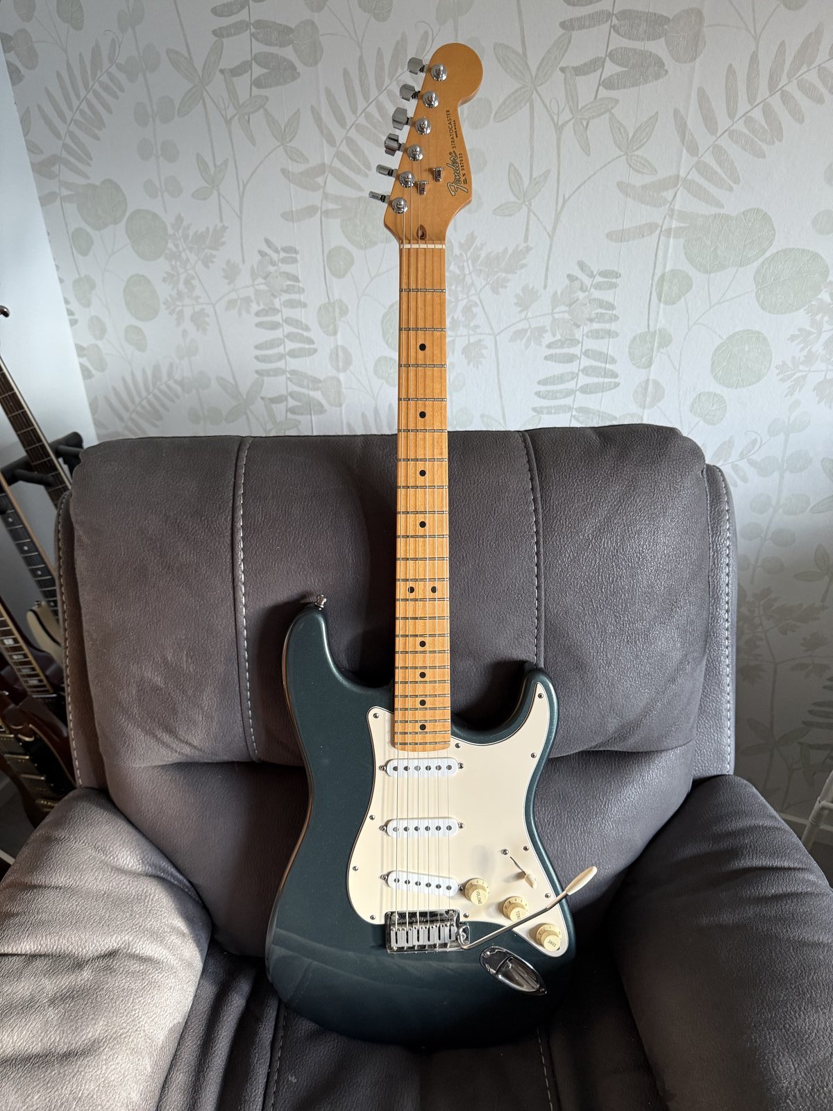 Todella siisti alkuperäinen American Standard. Leppärunko, vaahterakaula ilman erillistä otelautaa, 22 hyväkuntoista nauhaa. TBX-tonekontrolli. Kova kotelo mukaan. Ei vaihtoja. Hinta: 1650 € | |