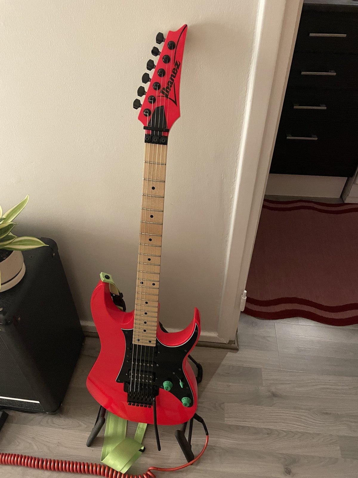 Upeassa kunnossa ja soittotatsissa oleva reissue RG. Pientä modausta tehty; mm. - Vihreät Ibanez original potikan nupit ja kytkimen nuppi - DiMarzio Cliplok - Tremol-No - DiMarzio Titan -tallamikki - Ibanez UTA20 hiilikuitu tremolo arm Sijaitsee Tampereella! Lähetys onnistuu Hinta: 800 € | |