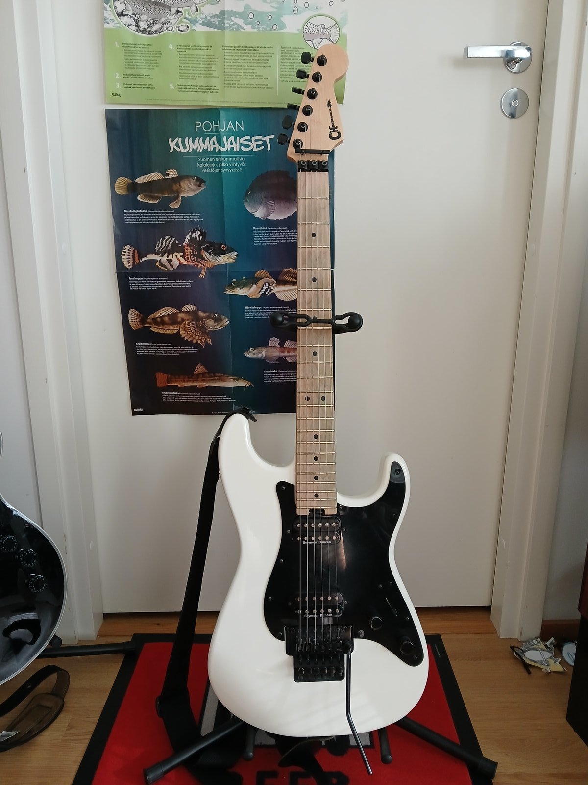 Tuollainen laadukas Charvel olis joutilaana. Yleiskunto todella hyvä ja ainut miinus nuo pari pientä maalilohkeamaa( näkyy kuvissa). Speksejä löytyy netistä jos ei ole tuttu verme. Ja floikka pitää vireen törkeän hyvin. Kovaa laukkua ei kitaralle ole, joten mieluiten nouto niin pääsee samalla kitaran testaamaan. Tai voin tuoda järkevällä säteellä Jyväskylästä. Yht.otot mieluiten puhelimitse /pikaviestein. Vaihdossa kiinnostais ainoastaan Ltd EC-1000FR Hinta: 650 € | |
