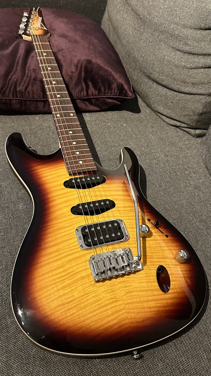 Japanissa 80-luvulla valmistettu monipuolinen sähkökitara moneen tyyliin. Kaikki alkuperäistä paitsi vibrakampi. Lehmus body, vaahtera kaula ruusupuu otelaudalla. 24-nauhaa. IBZ humppari mikit, duo soud kelojen jakotoiminto volume potikoissa. Pro Rock'r tremolo molempien päiden lukituksella. Smooth tunerII virittimet. Rockcase laukku mukaan. Lähetys onnistuu. Hinta: 490 € | |