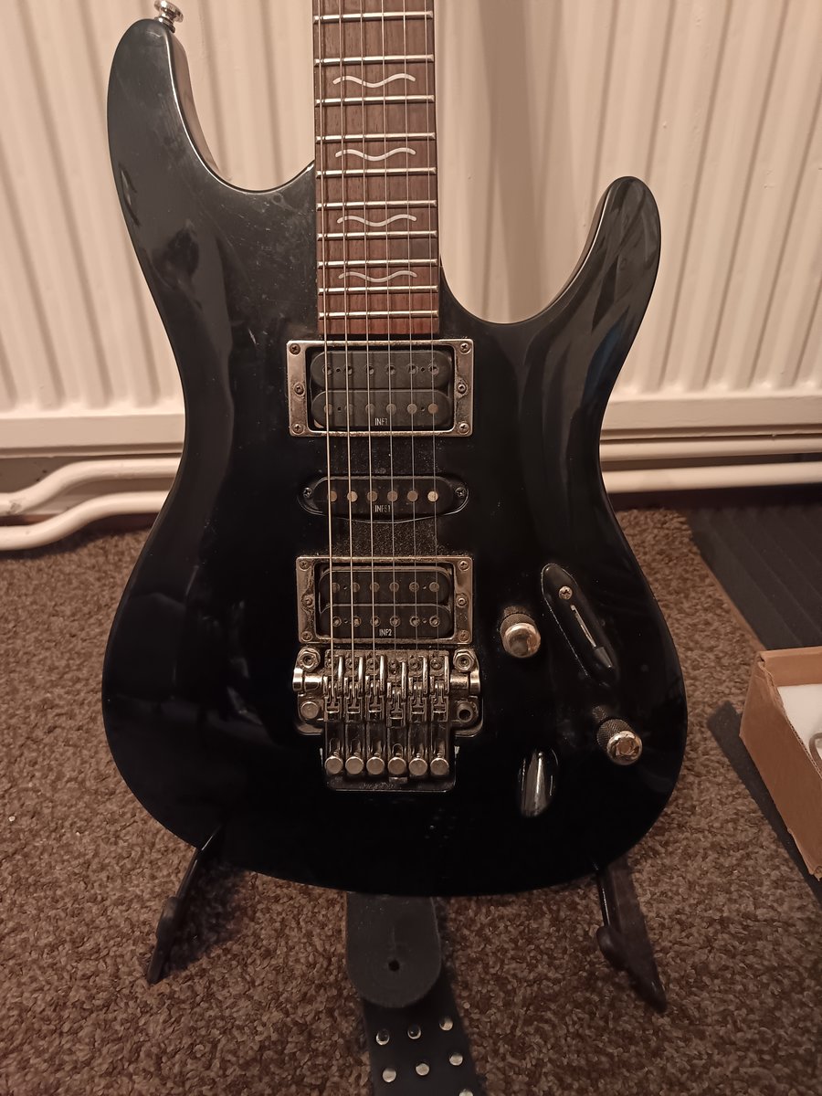Harvinaiseksi käynyt vuoden 90 proffa jaska. Long story short niille jotka eivät taustoja tunne, Jacksonin Professional malleja tehtiin japanissa 1990-1994 samoilla spekseillä kun jenkkimalleja, japsien valmistus kuitenkin lopetettiin kun ne hieman halvempina mutta yhtä laadukkaina kuin jenkit alkoivat syödä jenkkimallien markkinaa. Näissähän on tietenkin eben otelauta, MOP sharkfinit ja reunalistat, kuten aidossa Jacksonissa kuuluu ollakkin. Tässä on kyseessä Fusion malli, jota on matkanvarrella vähän modailtu. Refin, tallana FR2 ja tallamikkinä EMG 81 tonella ja volalla. Alkuperäiset J200 keski- ja kaulamikki ovat kytkemättä. Mukaan löytyy kova laukku jossa lähetys onnistuu. Hinta: 1100 € | |