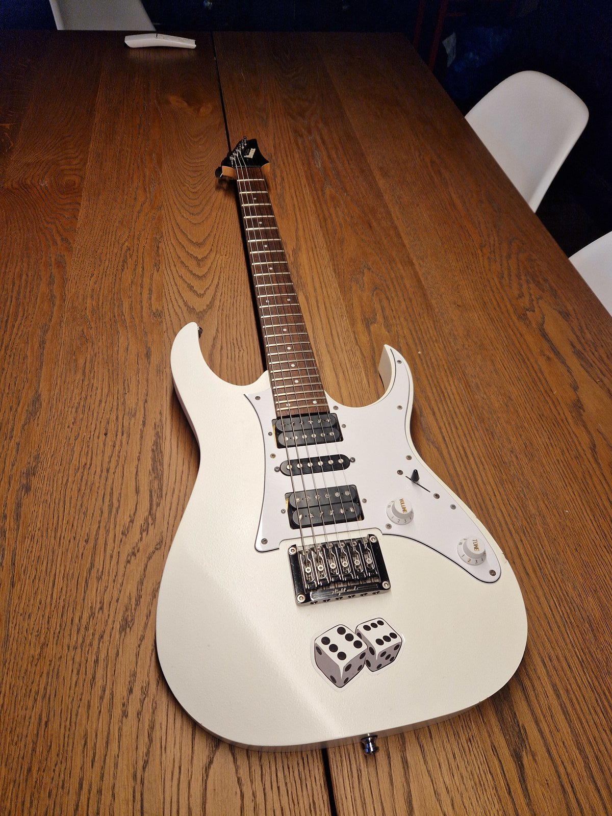 Ibanez RG1451WHP, hieman käytön jälkeä mutta yleisilmeeltään siistissä kunnossa oleva kitara. https://ibanez.fandom.com/wiki/RG1451 Tallamikki DiMarzio Tone Zone https://www.thomann.de/fi/dimarzio_dp155_bk.htm Kaulamikki DiMarzio Air Norton https://www.thomann.de/fi/dimarzio_dp193bk.htm Mukaan Ibanezin pussi Hinta: 500 € | |