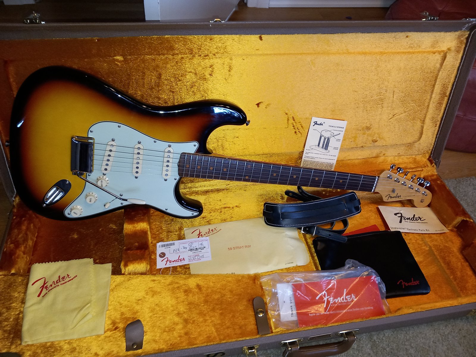 Vm. 2017 Suosaarni runko. 9,5” radius Kaulan paksuus 1. nauhalta 21.5 mm 12. nauhalta 24.2 mm Amalfitanon mikit Schroderin wraparound Kluson Deluxe virit. Nauhakoko 47095 Valmistettu Philadelphian pajalla. Nauhoissa ei kulumia. Väittäisin että nauhat ovat rosteria tai sitten kitaralla ei ole soitettu juuri lainkaan. 3,1 kg Ei vaihtoja. Hinta: 2750 € | |