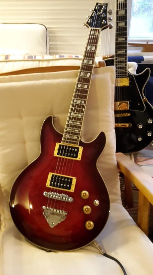 Kyseessä arvostetun muusikon puoliakustinen ex-kitara jonka olen häneltä ostanut. Kari Niemisen (Versoul) tekemä, ennen Versoul tuotemerkkiä. Paljon hienoja yksityiskohtia, mm. lehtikultaa käytetty. Speksit löytyy kuvista. Kaula on aika ohut, hieman v-profiili. Satulan leveys 43,5 mm. Painoa 2650 g. Nauhoissa vähäistä kulumaa, lienee hiotut. Kova kotelo on nähnyt keikkaelämää kuten kitarakin. Hinta: 4500 € | |