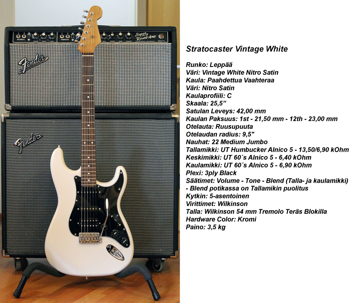 HUOM! NOUTO * Kitara on säädetty ST1 – Stratocaster Vintage White * Specsit löytyy kuvasta * Kitara on tehty uusista ja käytetyistä osista * Mikit ovat Uraltone Alnico 5 * Paino on 3,5 kg Hinta: 350 € | |