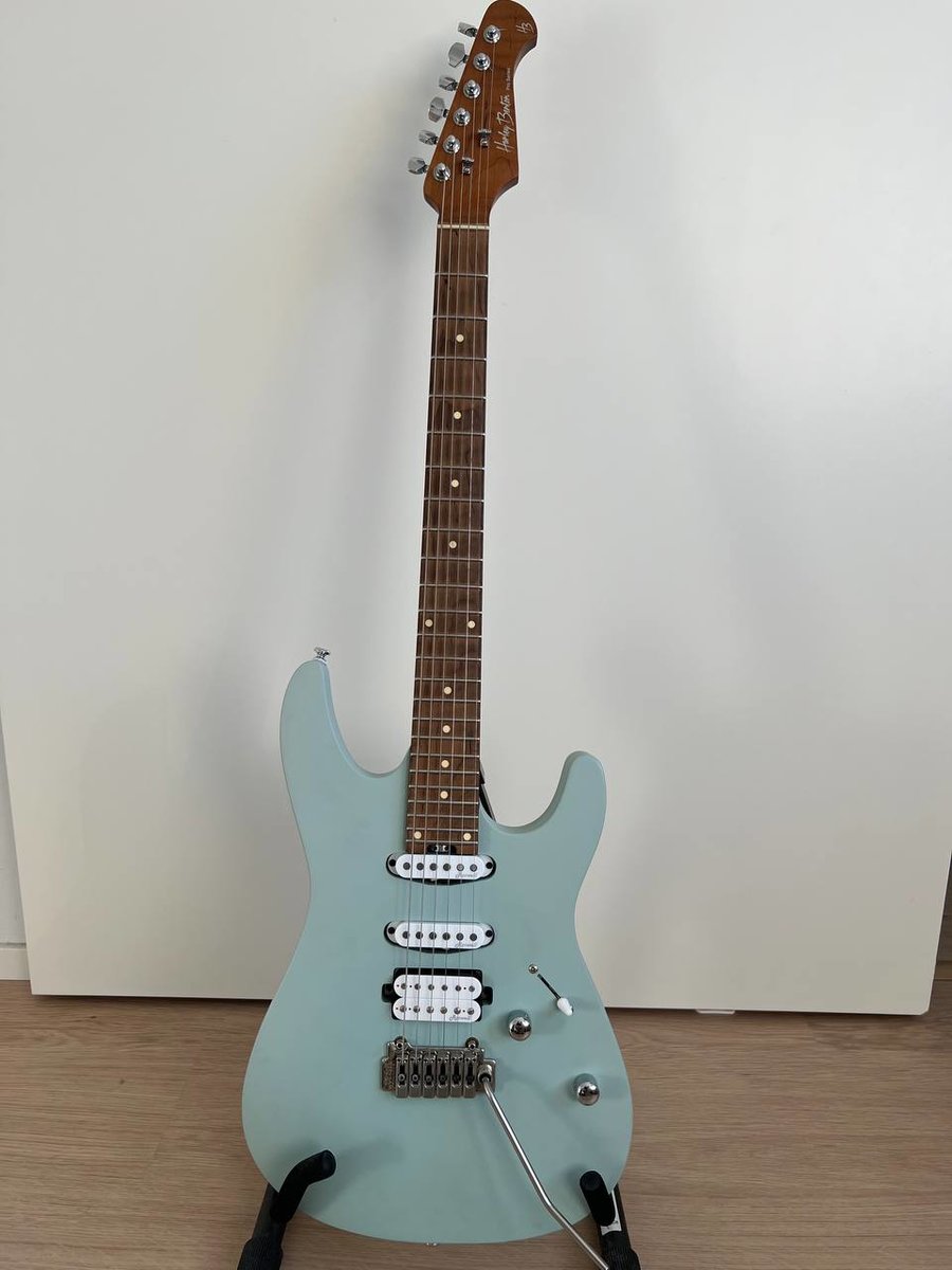 Todella hyväkuntoinen Strato HSS tyyppinen sähkökitara. Tallamikissä puolitus push-pull. Otelauta öljytty, nauhat kiillotettu, kaula, tremolo ja intonaatio säädetty kohdilleen uusille 10-46 kielille. Kampi ei ole alkuperäinen. Runko: Täysleppä Kaula: Paahdettua vaahteraa, pulttikiinnitys, helppo pääsy viimeisiin nauhoihin, satiiniviimeistely Skaala: 648 mm (25,5") Otelauta: Ruusupuuta, 22 nauhaa reunalistoilla, satiiniviimeistely, 12" Lapa: Mustaksi maalattu, monogrammilla Upotukset: Neliömäinen blokki Mikkielementit: 2 x single coil + 1 humbucker Säätimet: 1 x volume-säädin push-pull-toiminnolla, split-coil humbuckeriin + 2 x tone 5-asentoinen mikrofonin valintakytkin Talla: Modern tremolo Virityskoneistot: Valettua nikkeliä NuBone-satula Väri: Vintage Sunburst Body: solid alder Neck: Roasted maple, bolt-on with easy access to the last frets, satin finish, Scale: 648 mm (25,5") Fingerboard: Rosewood, 22 frets with binding, satin finish, 12" Headstock: painting in black, with monogram Inlays: square block Pickups: 2 x single coil + 1 humbucker Controls: 1 x volume with push pull, to split humbucker + 2 x tone 5-way pickup selector switch Bridge: Modern tremolo Machine heads: Diecast, nickel NuBone nut Colour: Vintage Sunburst https://staggmusic.com/en/products/ … ctric-guitar-with-solid-alder-body/ Stratocaster Superstrato Hinta: 135 € | |