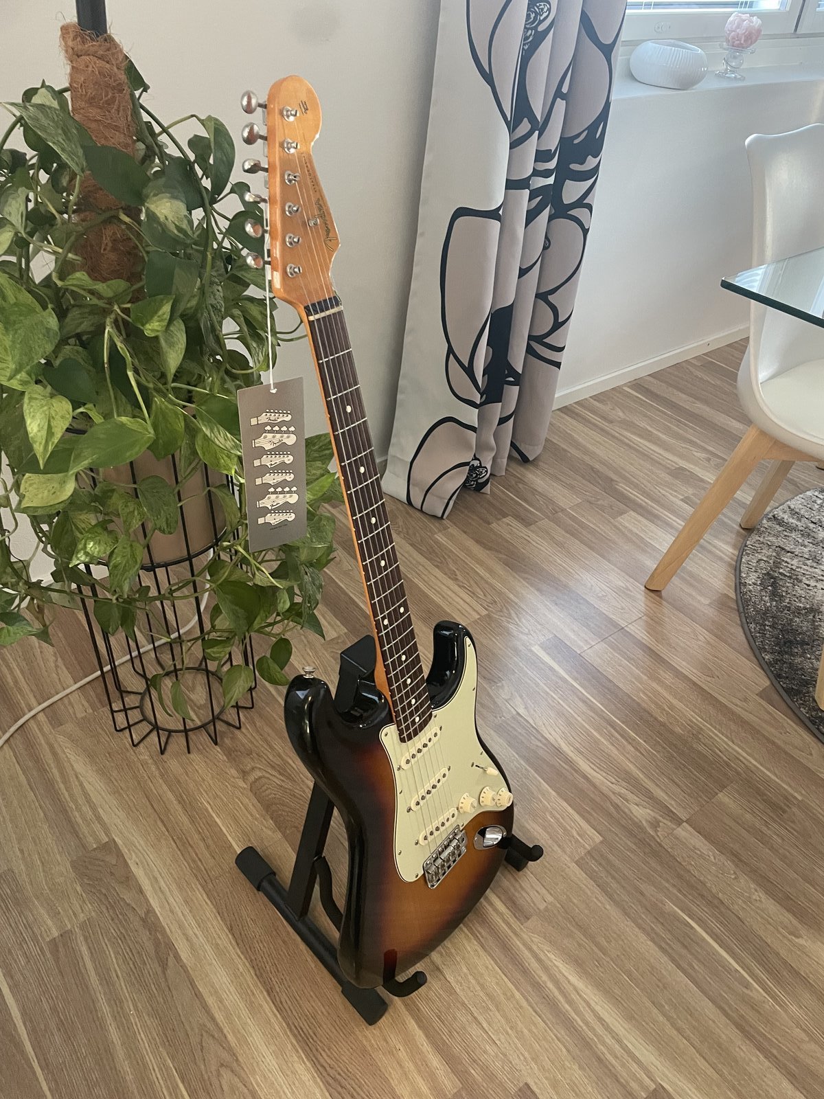 Myydään Fender Stratocaster (2007, Made in Mexico), sarjanumero MZ7126545. Kitara on ollut yhdellä omistajalla uudesta asti ja sitä on pidetty erittäin hyvässä kunnossa – ei kolhuja, ei naarmuja, lähes uudenveroinen. Äskettäin huollettu: • Kitara ja otelauta putsattu, otelauta öljytty • Uudet kielet vaihdettu • Tallajouset, tallan kiinnitysruuvit, kielten korkeus ja intonaatio säädetty • Elektroniikka tarkistettu ja mikkien korkeudet säädetty • Mikkikytkin voideltu (rohina poistettu) Mukana laadukas Gatorin kova laukku sekä alkuperäiset paperit ja tarvikkeet (kuvassa). Täydellinen soitin harrastajalle tai keikkakäyttöön – klassinen Fender-soundi ja erinomainen soitettavuus. Hinta: 649 € | |