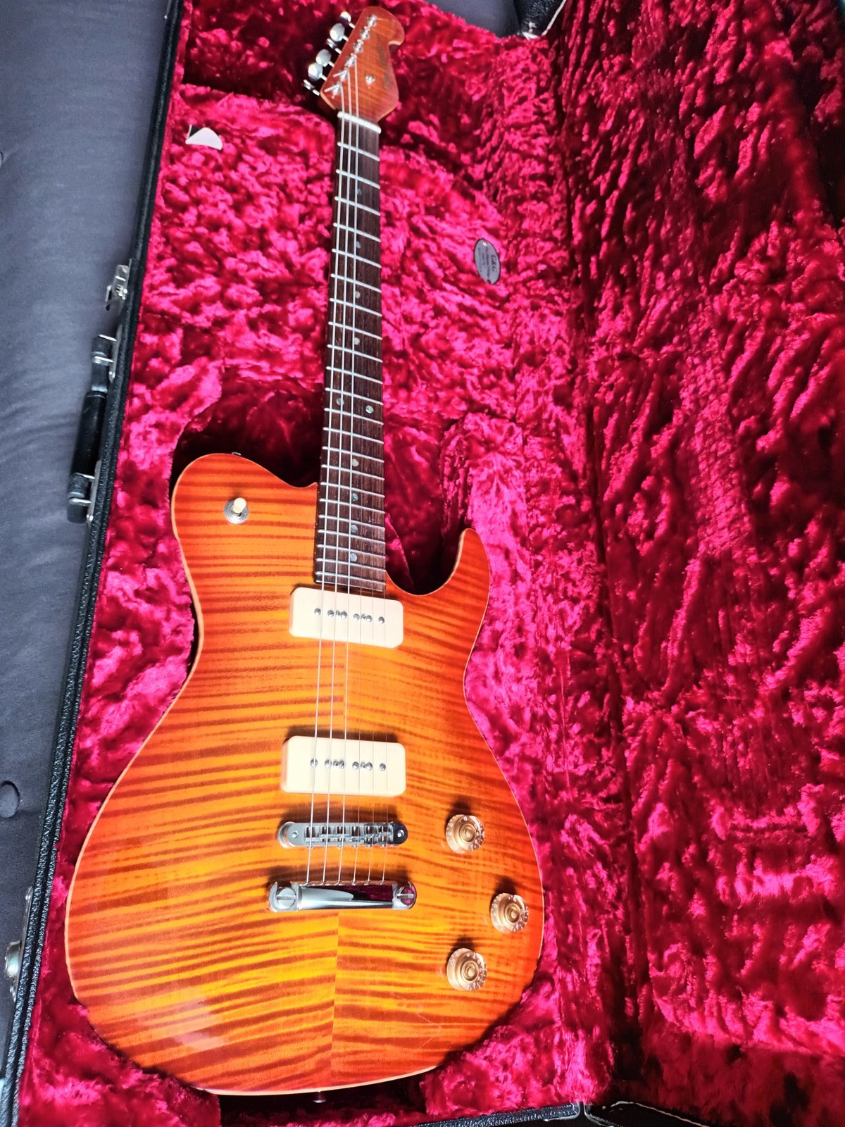 Body: Mahogany/flame top Neck: Mahogany/rosewood Neck size: 24.75 scale, 1 5/8 nut Neck shape: Round back medium Fingerboard radius: 10" Bridge: Tone Pros bridge/tail Pickups: Fralin P-90 Lukkovirittimet vaihdettu tavallisiin Ehkä vaihto ?. Hinta: 2500 € | |