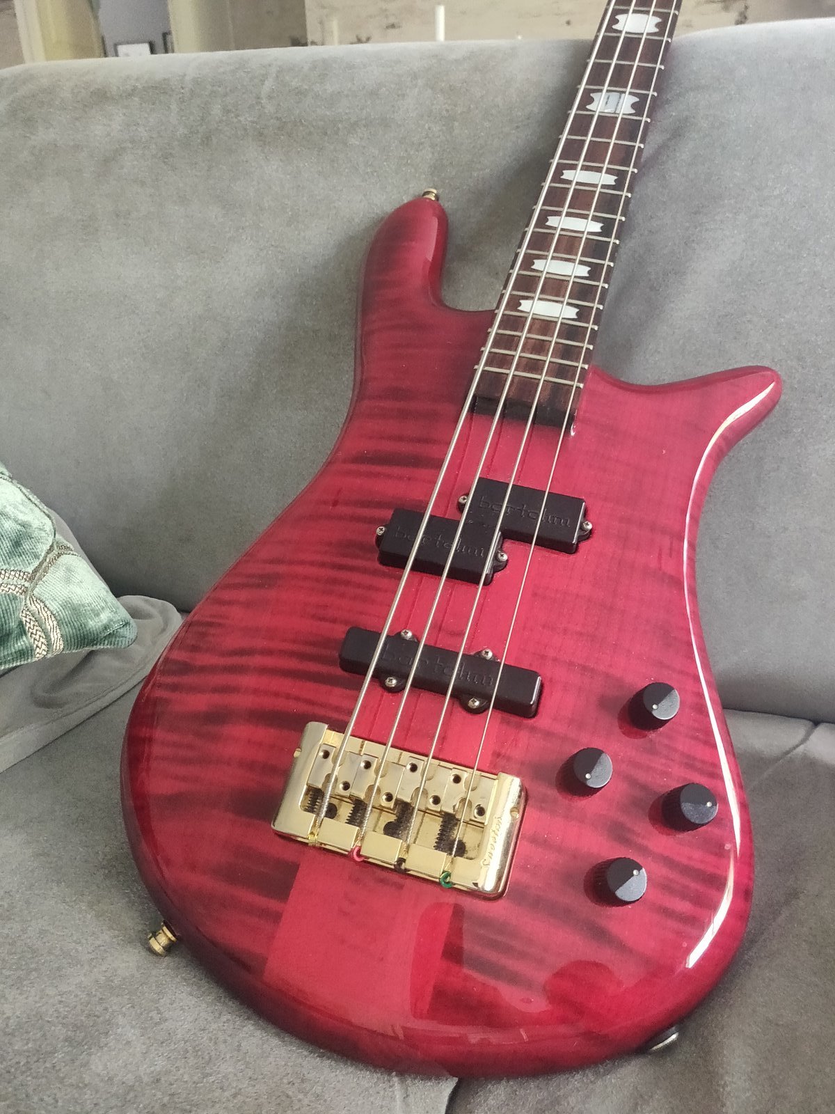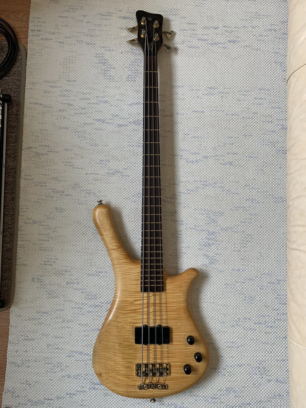 Myyntiin Warwickin harvinaisuus vuosituhannen taitteesta. Vaikuttava täys loimuvaahtera runko. Näitä ei tahdo nykyään nähdä missään, koska matsku on kallista. Uniikki elektroniikka jossa humpparin keloja voi blendata ja kummallekin kelalle on oma 2 alue eq. On yllättävän monipuolinen ratkaisu. Kaikkea hevistä humppaan. Ikäisekseen oikein hyvässä kunnossa. Potikat vaihdoin mustiin, alkuperäiset kultaiset tulee myös mukaan. Topattu laukku ja hihna+nylon varmistimet mukaan. Lähetys mahdollista tukevassa pahvilaatikossa. Ei vaihtoja tällä kertaa. Hinta: 1800 € | |