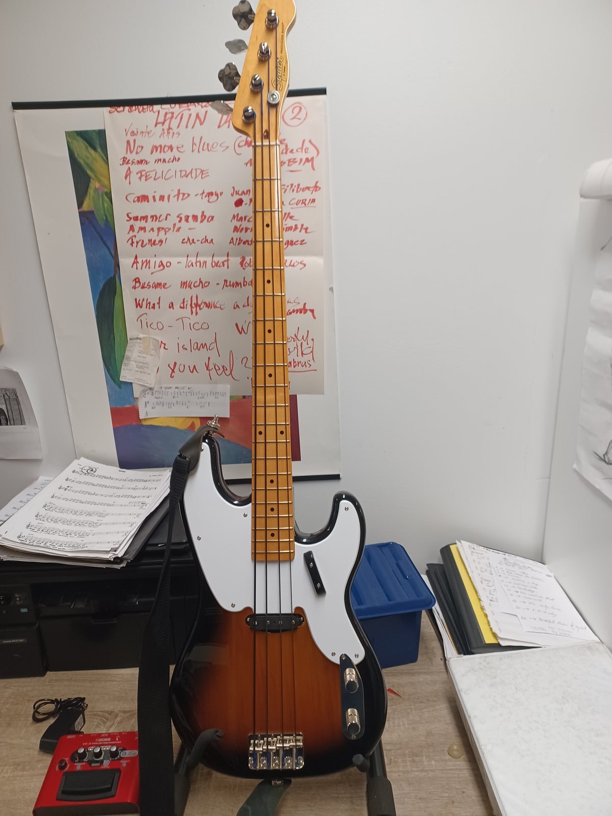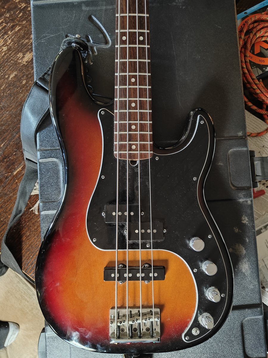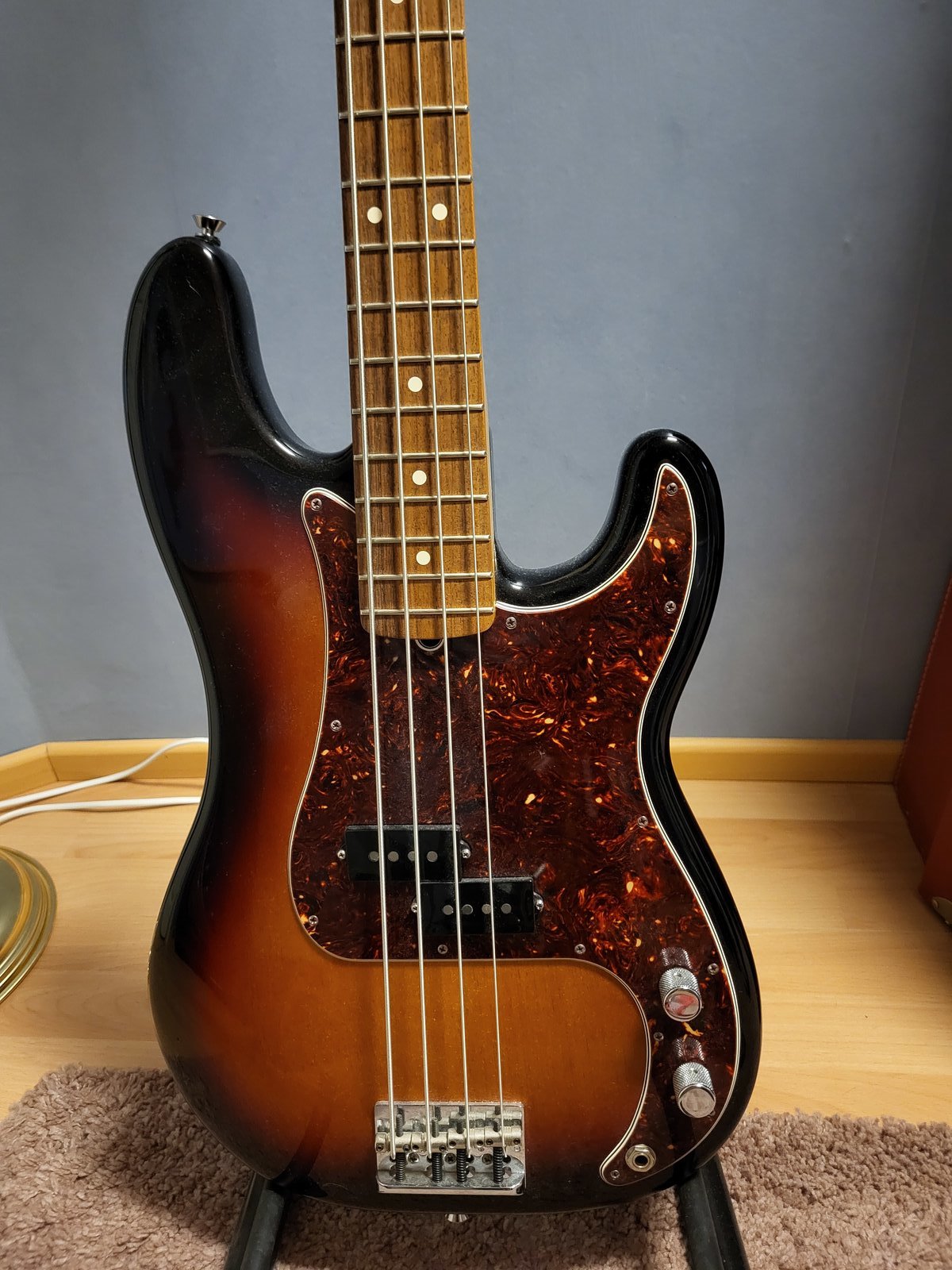 The real thing. Precision Am Standard, kuulostaa juuri niin hyvältä kuin aidon presarin kuulukin, oli sitten flatit tai roundit kielet. Nyt roundit, mutta molemmat tulee mukaan. Soitettavuus erinomainen, hyvissä säädöissä. 15 vuotta on tuonut soundiin vaan parannusta, mutta ei mitään ylimääräisiä jälkiä mihinkään. Tästä ei presari enää parane. Sunburst, Rosewood ja Tortoise yhdistelmä on luonnollisessa valossa sävyiltään juuri kuten kuuluu. Kaula modern C, joten miellyttävä soittaa. Alkuperäinen kova laukku kuuluu mukaan, sekä mukana alkuperäiset laput ja säätötyökalut. Hinta: 1300 € | |