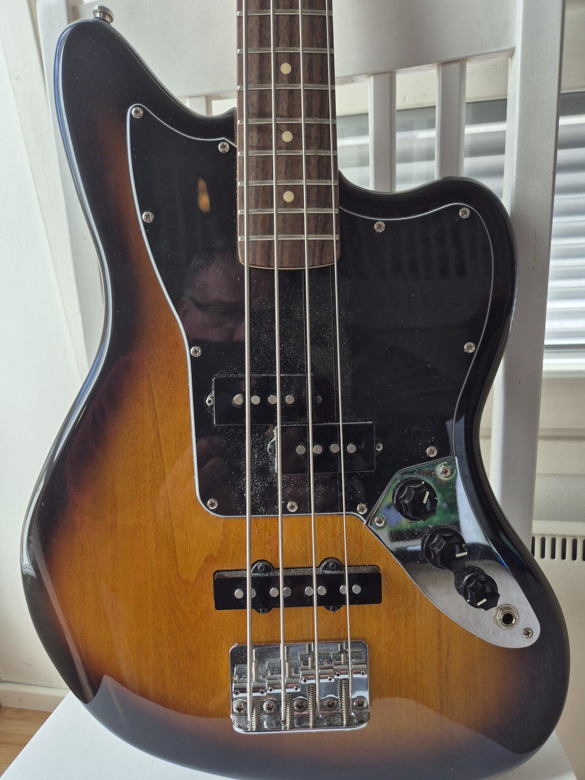 Lyhytskaalainen Squier Jaguar-basso 30" skaalalla. Vintage Modified-sarjaa. PJ-mikityksellä. 2-tone sunburst, josta näkee, mitä puuta runkoon on käytetty. Tasapainoinen hyvä soitin. Ei neck-dive, niinkuin ne läpivärjätyt mustat ja punaiset. Made in Indonesia. Bassoa on paranneltu seuraavasti: Schaller-virityskoneisto, luusatula, Lollar ja J.Salo-mikit, sähköt. Lisätietoa näistä kiinnostuneille. Soitin on siis hyvin keikkakuntoinen, pysyy ja on vireessä. Kuvissa on heijastuksia, lakkapinta on virheetön. Hinta: 450 € | |