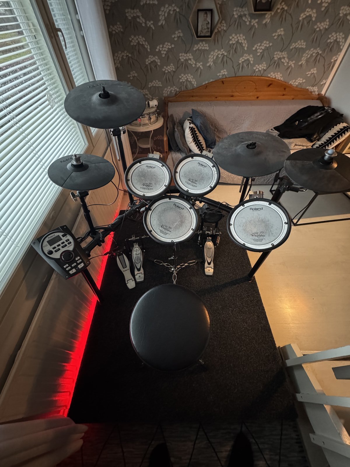 | Eli kuvan mukainen sähkörumpusetti itse rakennetulla ääntävaimentavalla alustalla vaikka kerrostaloon. Myydään muuton vuoksi pois raskainmielin. Setti on palvellut loistavasti useamman vuoden. Setissä uudet haitsut ja haitsupoljin. Ainoa vika mikä on niin ei pysty virveliin lyömään kantti iskuja. Muuten pelaa kuin unelma. Tästä jollekin useamman vuoden vanha ja hyvin toimiva setti pakettina. Setin mukana tulee: Roland td-11kv mesh-kalvoilla, 2hihat, 1 crash ja 1 ride. Hyvä rumpupenkki Pearlin virveliständi Pearlin tuplapedaalit Ylimääräinen toinen haitsu Ostettu ja ladattu hyvän soundinen äänipaketti. Itse tehty ääntävaimentava alusta joka oikeasti vaimentaa lattian kautta kantautuvista äänistä naapuriin. Alle asennettu led-nauha joka on mennyt poikki mutta uuden saa helposti laitettua. Hinta: 750 € | |