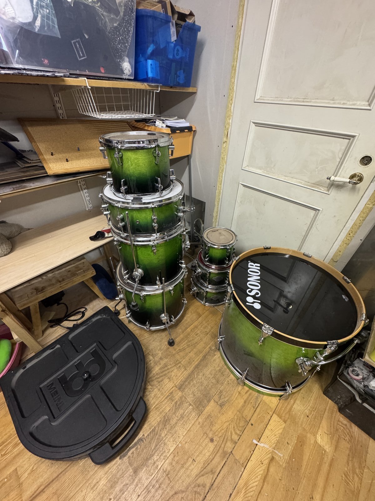 Satunnaisessa soitossa muutaman vuoden ajan ollut setti komeassa green fade värissä. Rummut: Basari 22" Tomit 8", 2kpl 10", 12" Lattiatomit 14", 16" Virveli 14" Lautaset: Ride 20" Meinl Classics Custom Hihat 14" Meinl Classics Custom (ei telinettä enää) Splash 8" Meinl Classics Mukaan löytyy muutama enemmän ja vähemmän kärsinyt crash Hardware: Sonor basaripedaali Penkki Sonor 200 virveliteline 2kpl Sonor 400 tuplateline 2kpl Sonor 200 teline 1kpl teline, jonka valmistaja ei tiedossa 1kpl pidempi ja 3kpl lyhyempää puomia lautasille 2kpl tomipidike Setti on hyvässä kunnossa lukuunottamatta bassorummun päällä olevaa jälkeä. Basarin kalvo on vaihdettu hetki sitten. 8" tomissa lyöntikalvo rikki. 10" tomeja löytyy 2kpl, 10 x 6,5 ja 10 x 8. Vaihdossa voisi kiinnostaa arvokkaammat tuplapedaalit. Hinta neuvoteltavissa. Lisää kuvia ja tietoja kysymällä. Parhaiten saa kiinni viestillä ilmoituksessa olevaan numeroon. Hinta: 850 € | |