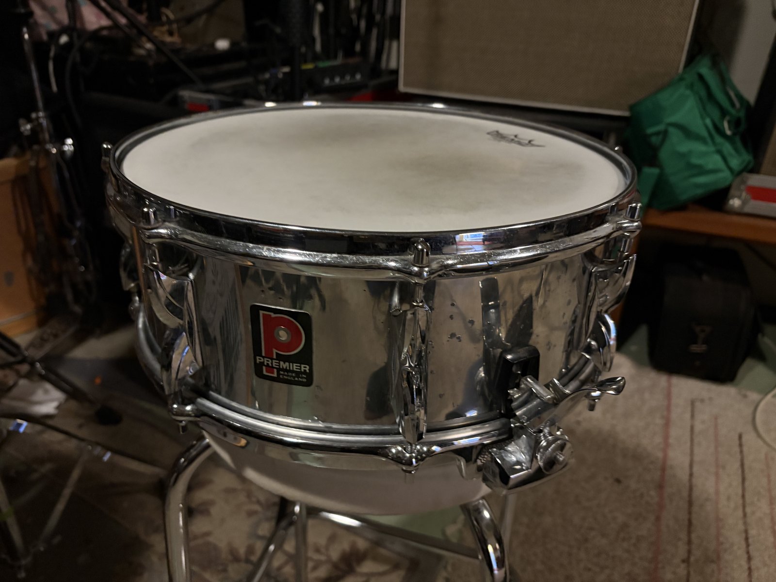 Loistava 70luvun supraphonic tyyppinen Premier 2000 alumiini snare. Suht uudet kalvot. Alkuperäinen matto josta muutama naru puuttuu. Pitting on normaalia näissä eikä vaikuta saundiin! Vaihdossa vois mennä puuvirveli, joku yleis ride tai huippu basarin pedaali kuten dw9000. Hinta: 190 € | |