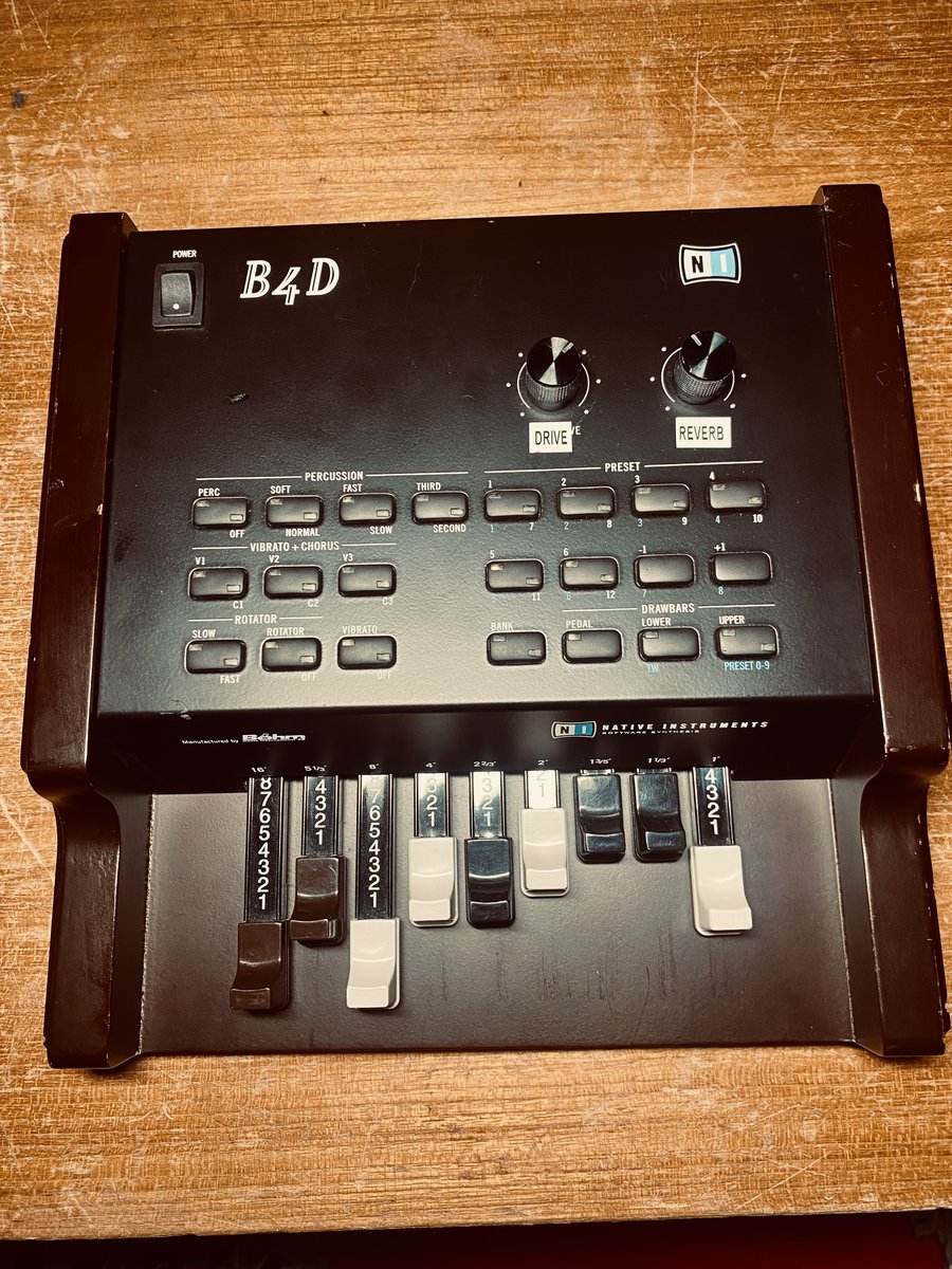 | Native Instruments B4D Drawbar Controller Jos käytät NI B4, Vintage Organ tai GSi VB3 -urkuplugareita, tää on se juttu. B4D tekee virtuaaliurkujen soitosta oikeasti käsituntumaa vastaavaa, drawbarit toimii kuten oikeassa Hammondissa. • 9 mekaanista drawbaria • 22 nappia ja 2 nuppia tärkeimmille toiminnoille (Leslie, vibrato, perkussio, volume, drive jne.) • toimii MIDI:llä, kommunikoi suoraan softan kanssa • valot kertoo heti missä moodissa mennään (Upper / Lower / Bass) • metallia ja puuta, jämäkkä ja laadukas laite Kaikki toimii kuten pitää, ei mitään vikoja. Sopii täydellisesti liveen tai studioon, tai jos vaan kaipaat sitä aitoa Hammond-fiilistä softaurkuihin. referenssi: https://reverb.com/item/9716158-nat … ruments-b4d-midi-drawbar-controller Hinta: 222 € | |