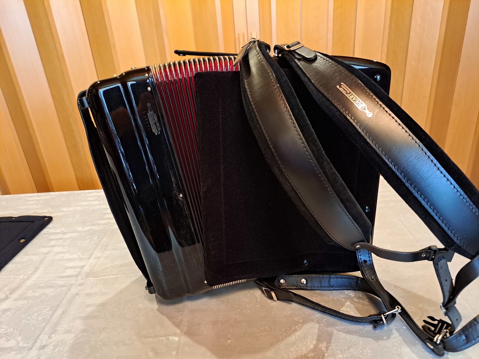Kuin uusi, Bucari hyvin pidetty ollut laukussa enimmän aikaa. Alkuperäiset remmet, ylimääräinen paljesuoja, kova laukku jossa pyörät. Myyn koska on tarpeeton. Paino vähän yli 10kg. Alin ääni g ylin a. Hinta: 4200 € | |